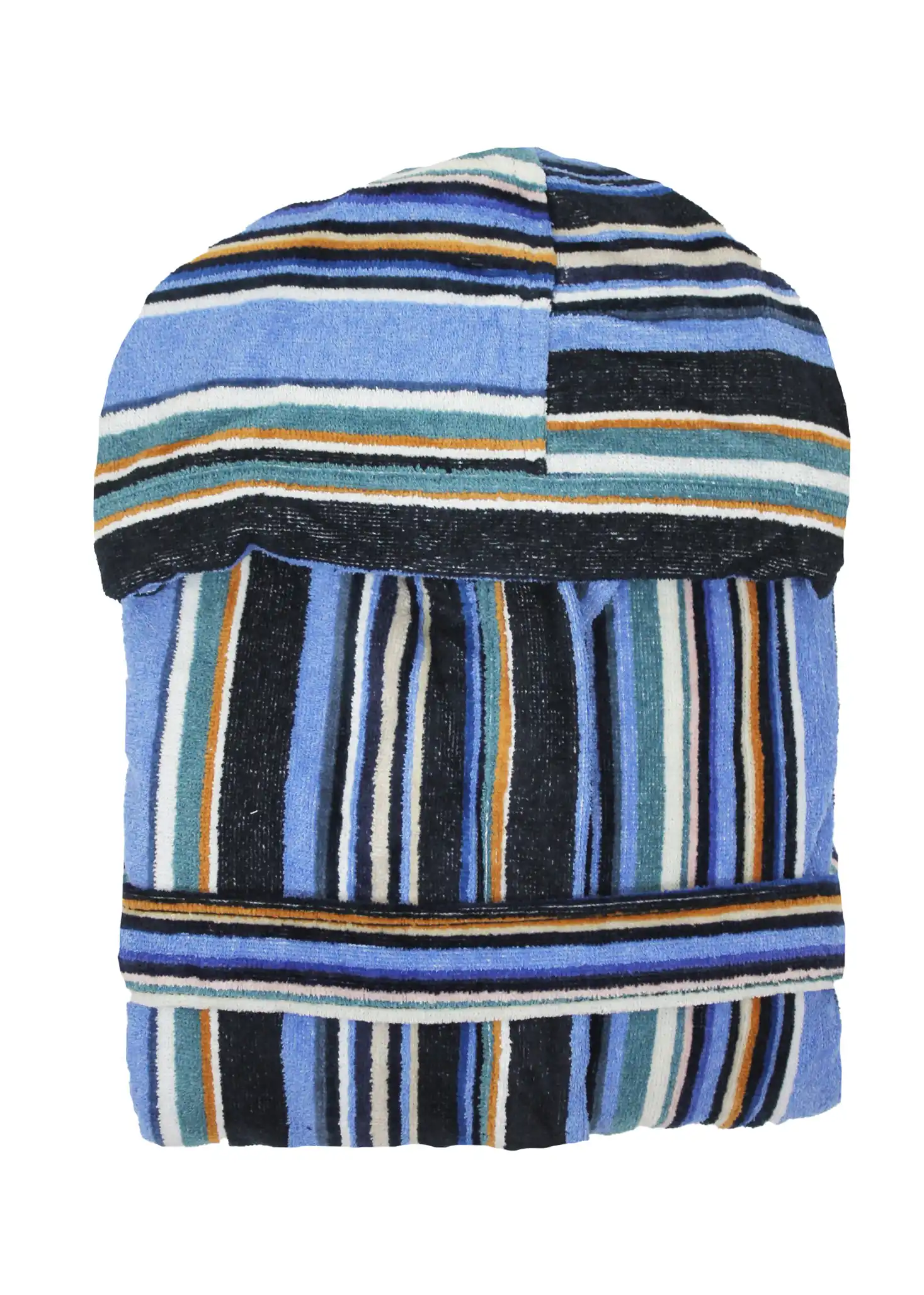 Decorato in “stile Missoni”, con fantasia cucita a righe longitudinali . L’accappatoio ha ampio cappuccio, tasche laterali e cintura in vita.
