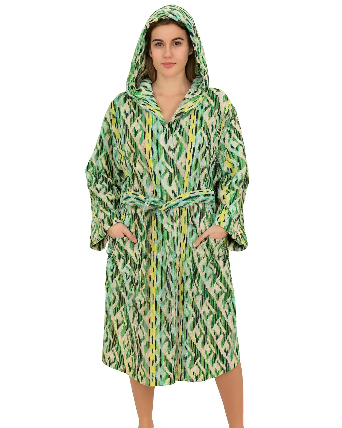 L’accappatoio ha ampio cappuccio, tasche laterali e cintura in vita.