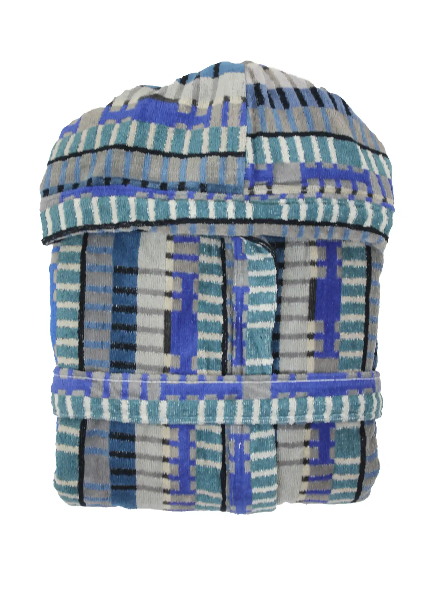 Decorato in “stile Missoni”, con fantasia moderna cucita a fantasia romboidale.
