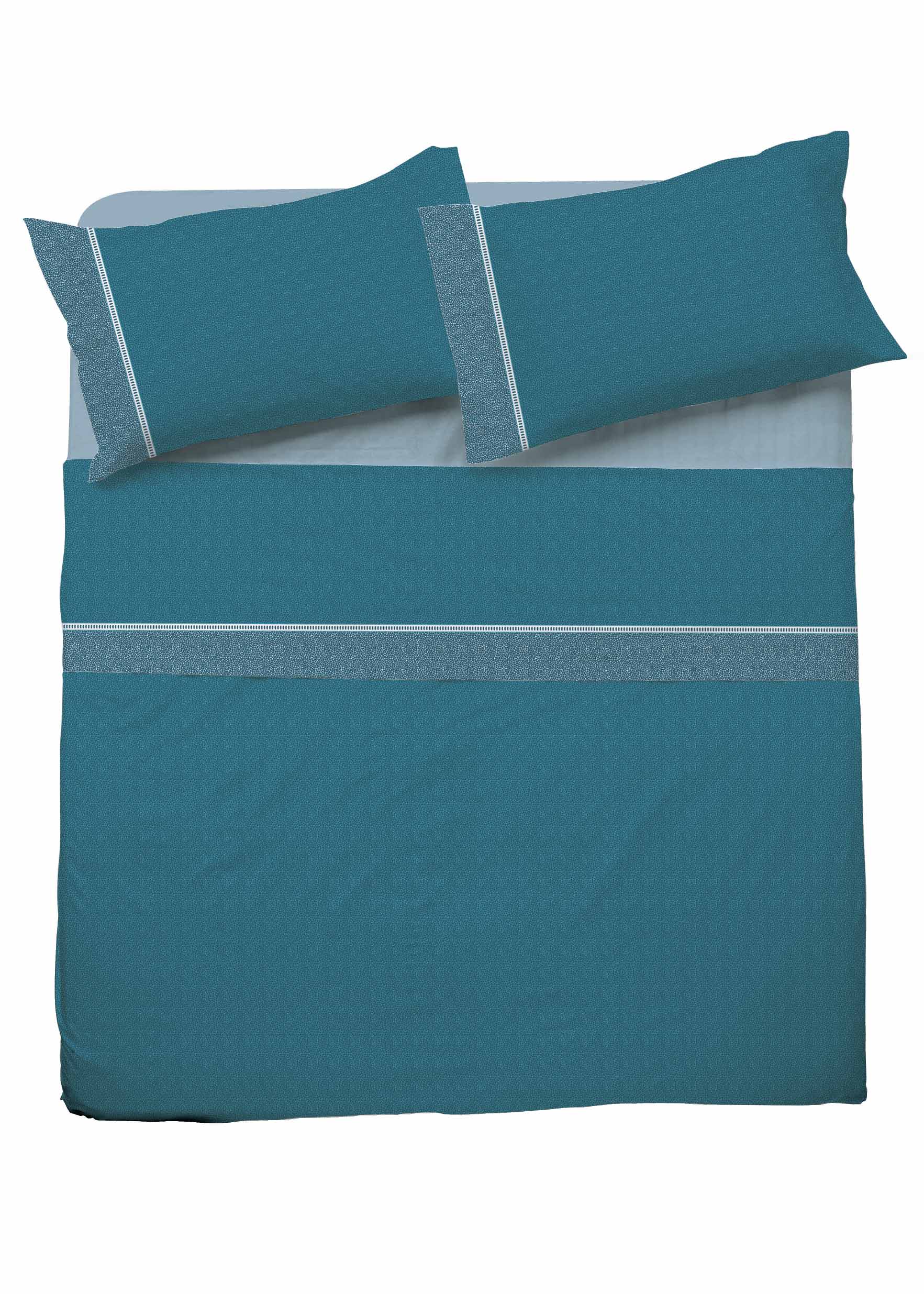 Completo letto 1 piazza e mezzo + 2 federe Venere di Novia, 100% in cotone, estremamente resistente, piacevole al tatto, fresco e facilmente lavabile. Disegno Crono color petrolio adatto ad ogni stile d’arredamento.