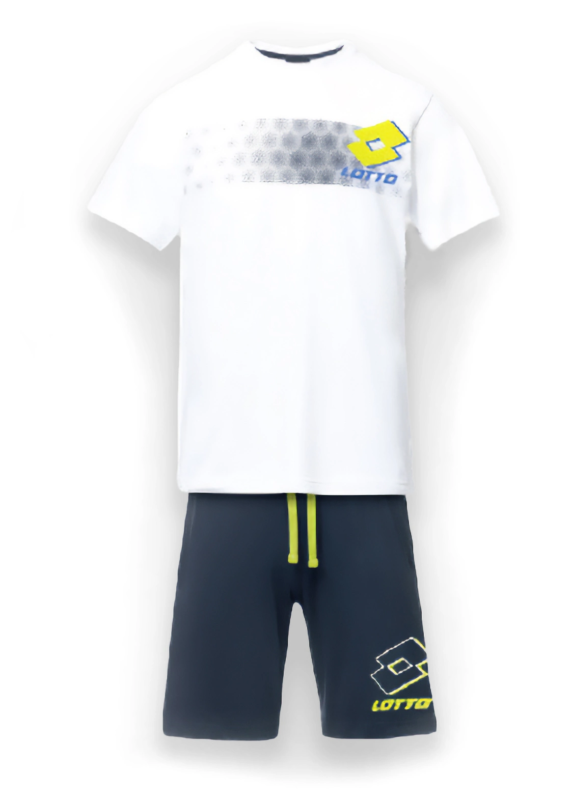 Maglia con colletto a girocollo e mezze maniche, tessuto leggero con tramatura jersey in 100% cotone; stampa anteriore colorata con logo Lotto. Pantaloncino a contrasto in tinta unita con elastico e laccetto in vita.
