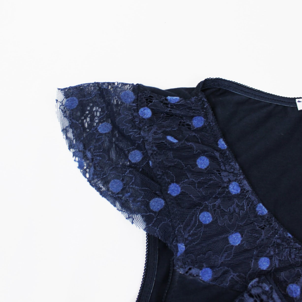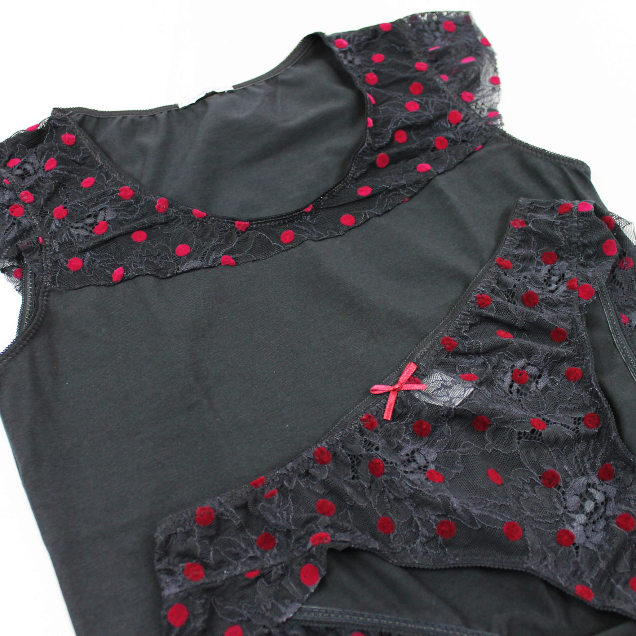 La canotta è realizzata in cotone elasticizzato decorato con pois, merletto stampato con metodo Flock, tecnica che permette di ottenere un effetto vellutato a rilievo dei tessuti stampati; lo slip è realizzato in cotone elasticizzato sul retro e in pois sul davanti.