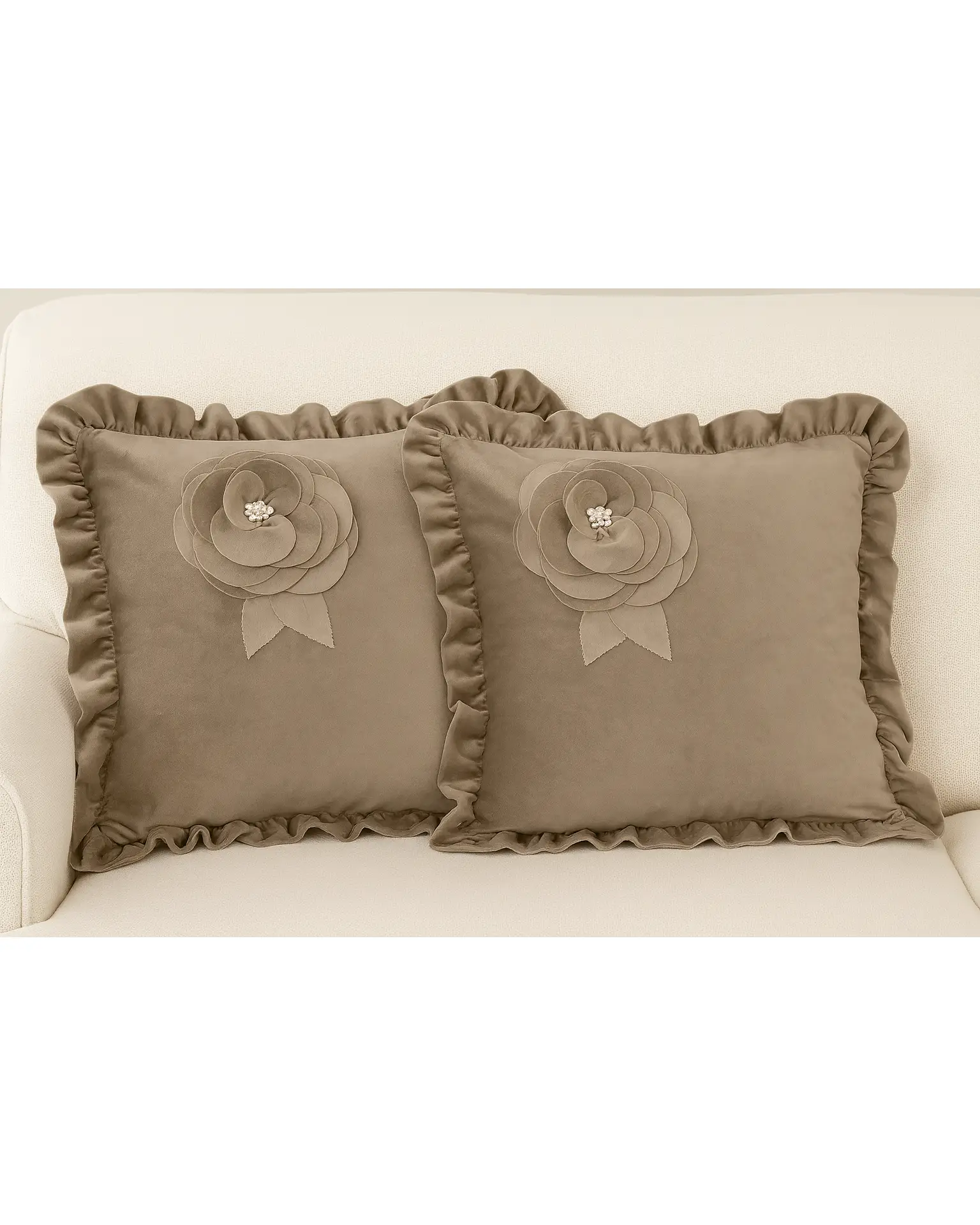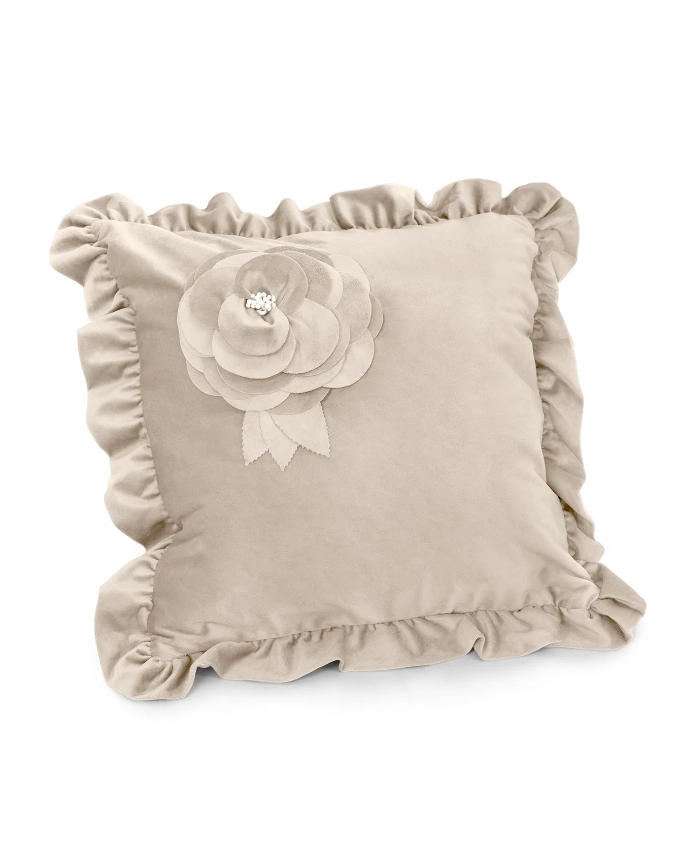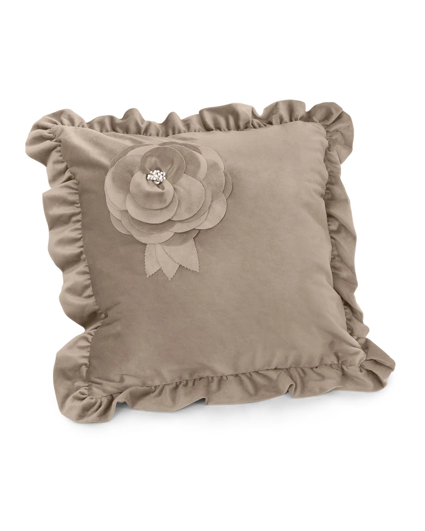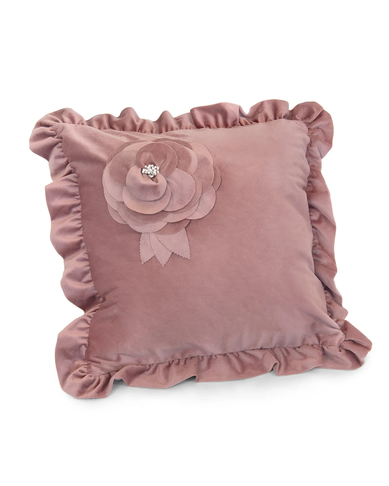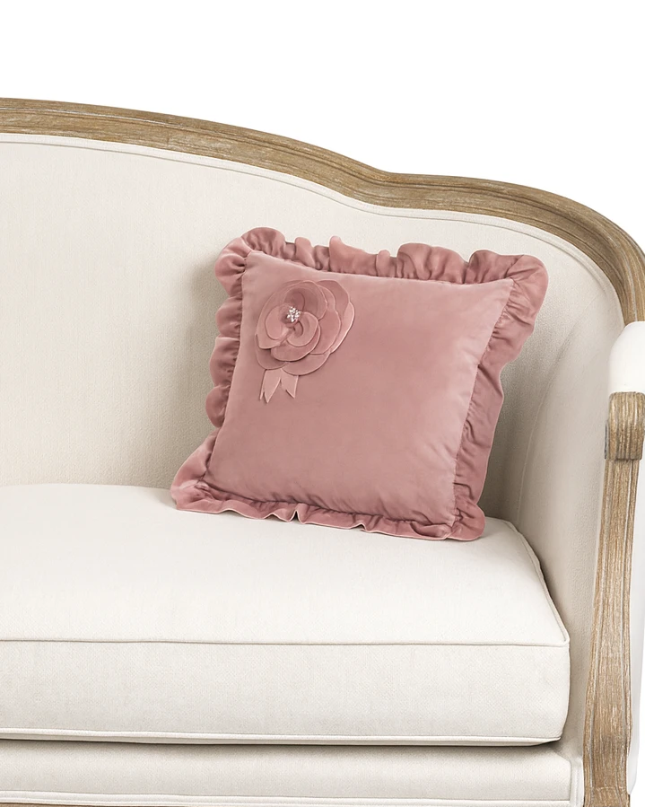 In soffice ed elegante velluto con bordatura in volant è arricchito da un’applicazione di tessuto che forma una rosa. In stile shabby chic.
