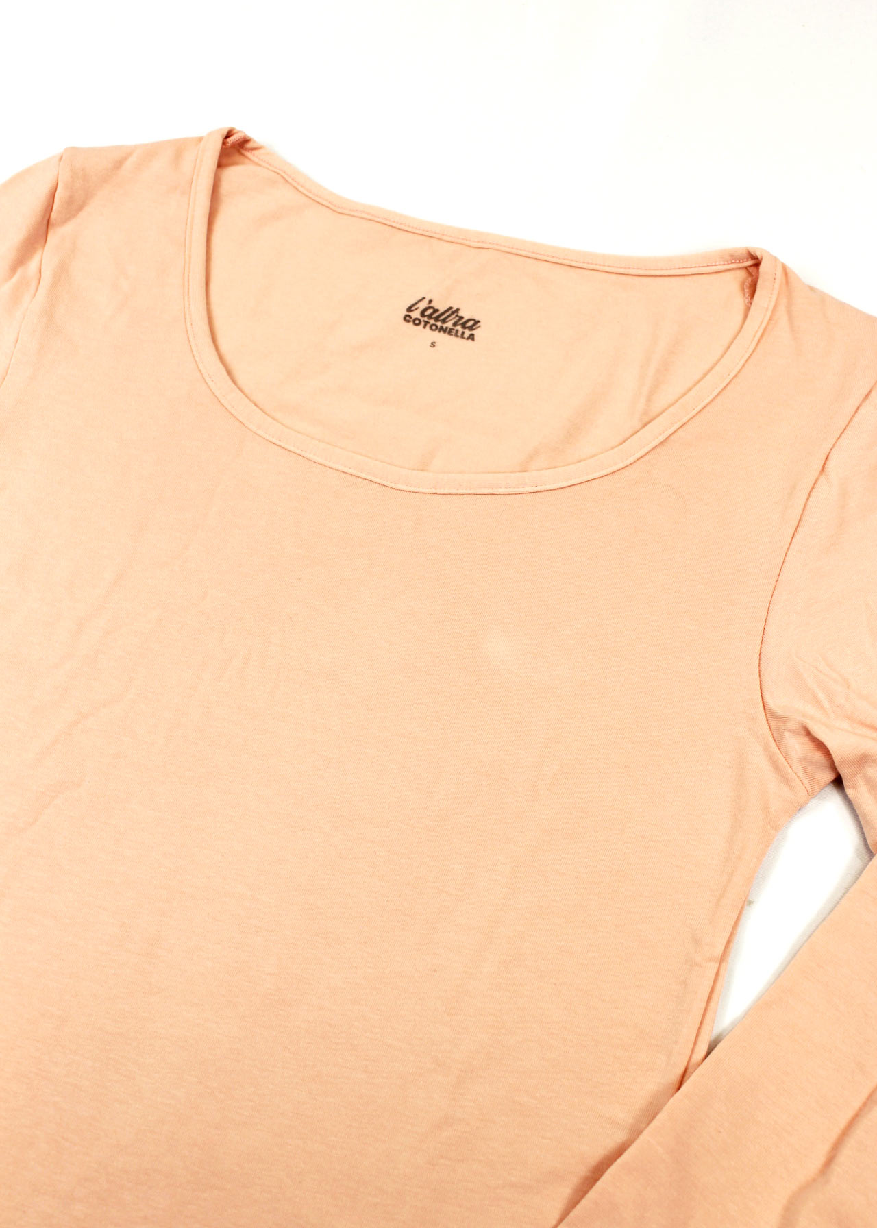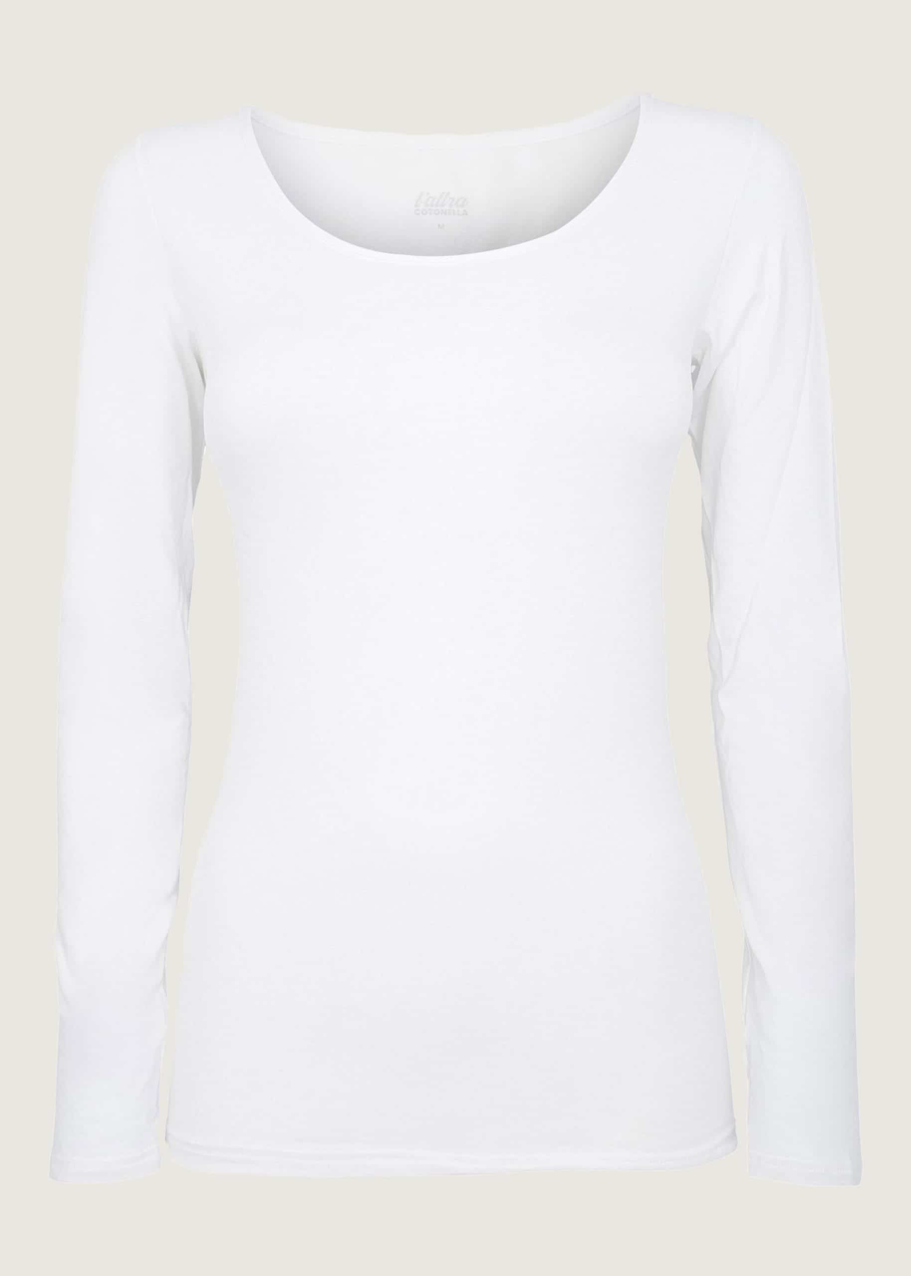 Maglia a manica lunga con scollo a giro di Cotonella in cotone bielastico garzato internamente, tessuto realizzato con filati di altissima qualità e morbidezza.