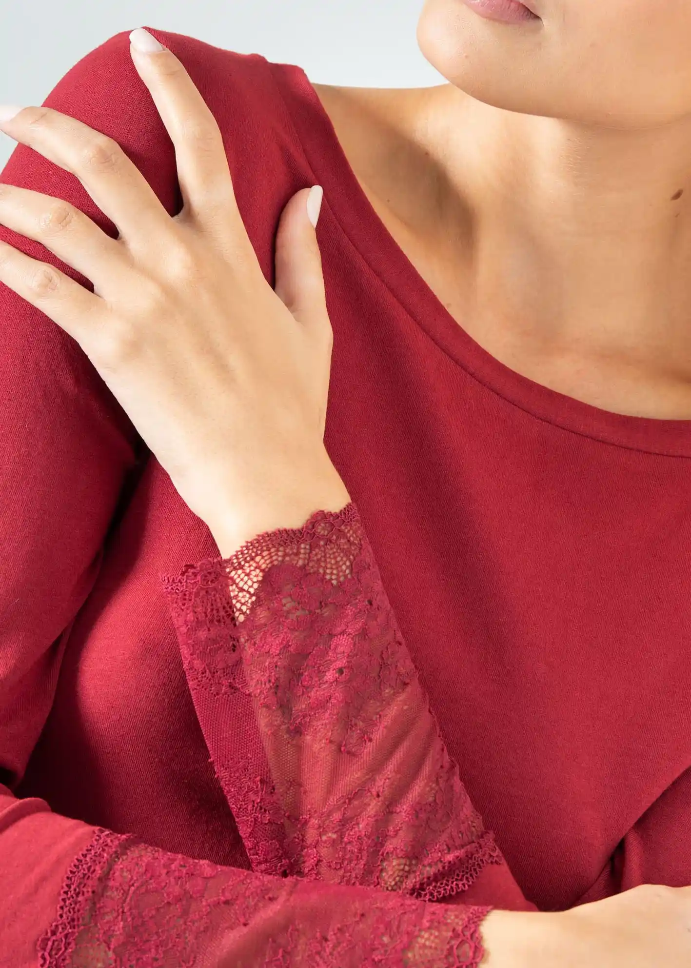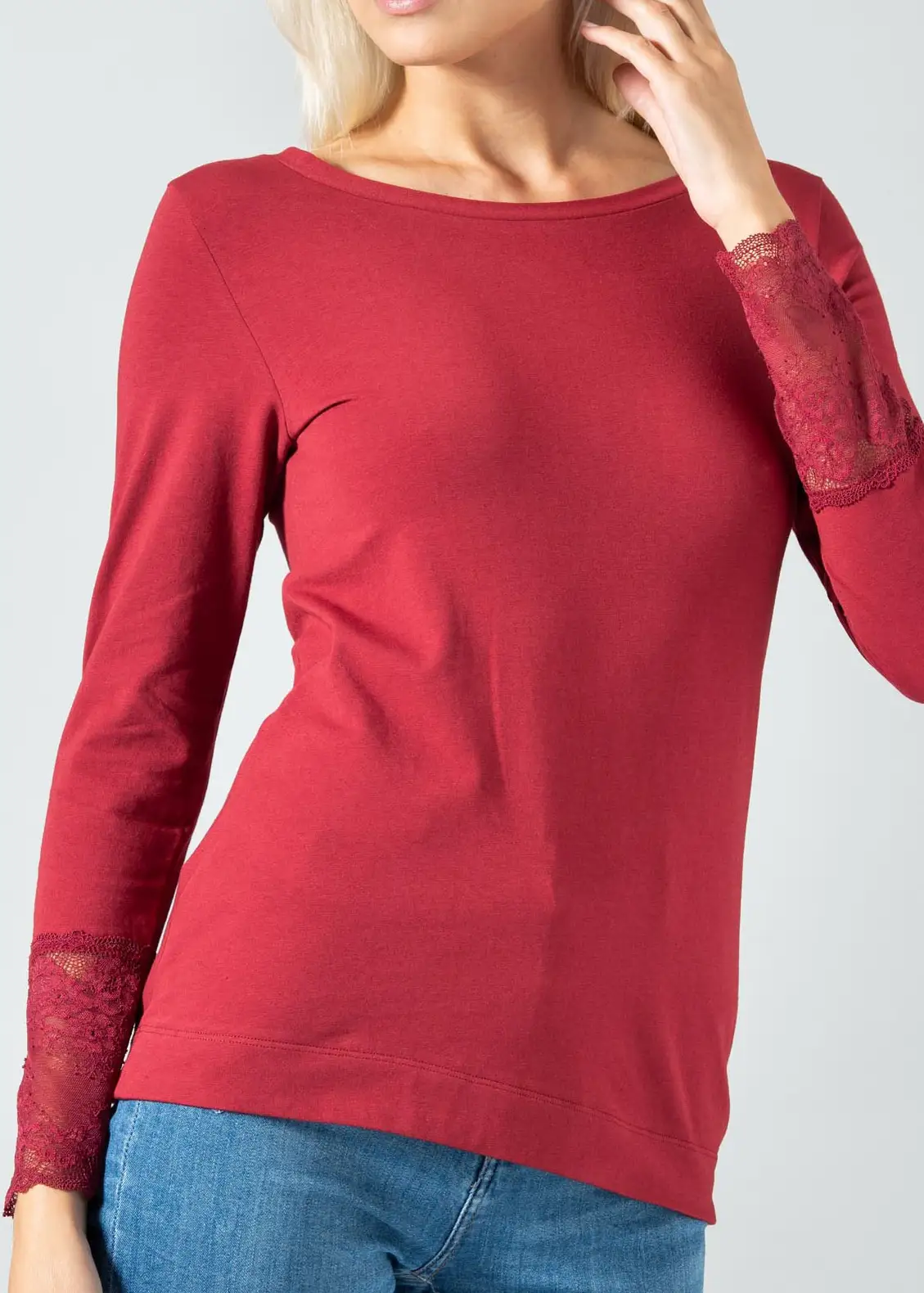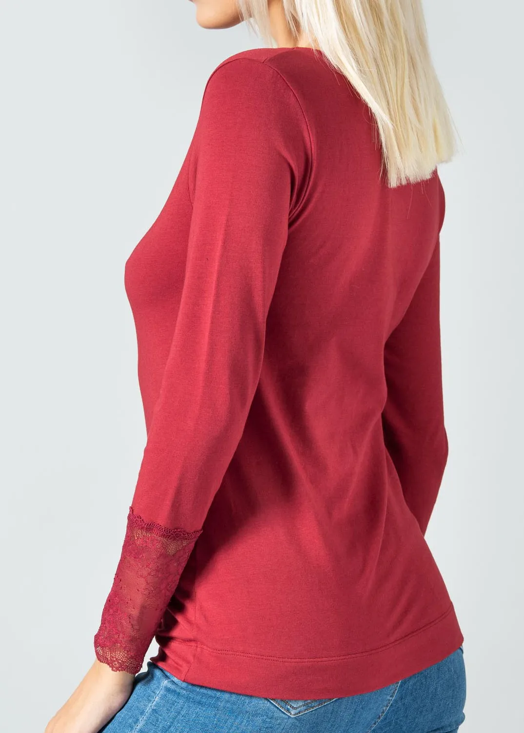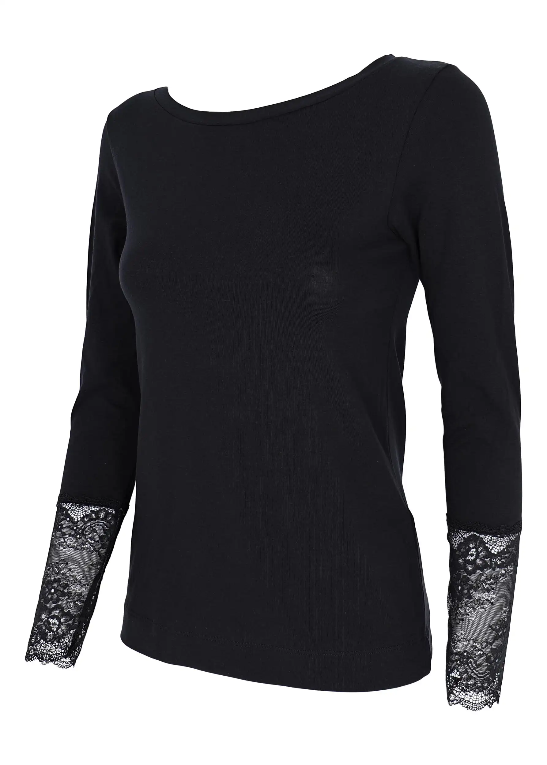 Maglia realizzata in Caldo cotone (95%) con una piccola percentuale di elastane (5%) per farla adattare al meglio alle forme del tuo corpo. Collo a giro leggermente svasato che lo rende più elegante e maniche con dettagli in Pizzo alle estremità dal polso . Ottimo per utilizzo anche come sottogiacca elegante per occasioni o per il tuo outfit giornaliero.