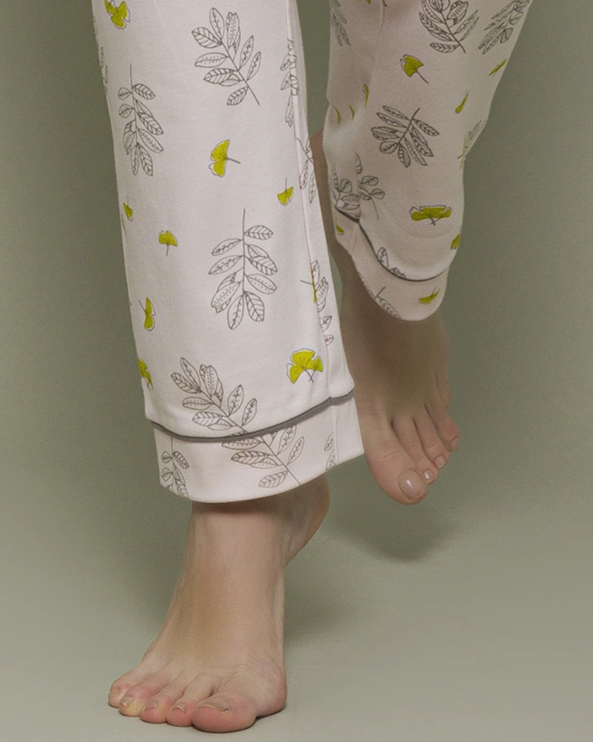 Pigiama donna rifinito minuziosamente con bordini a contrasto lungo maniche, colletto e aperura della maglia.