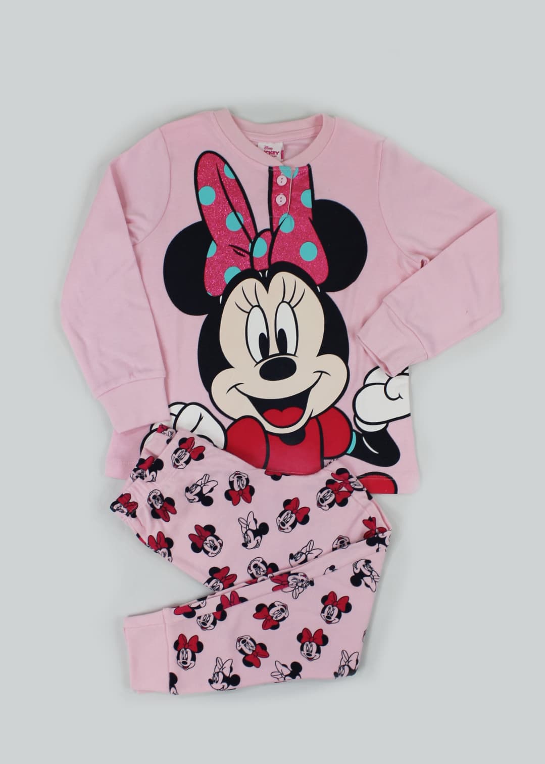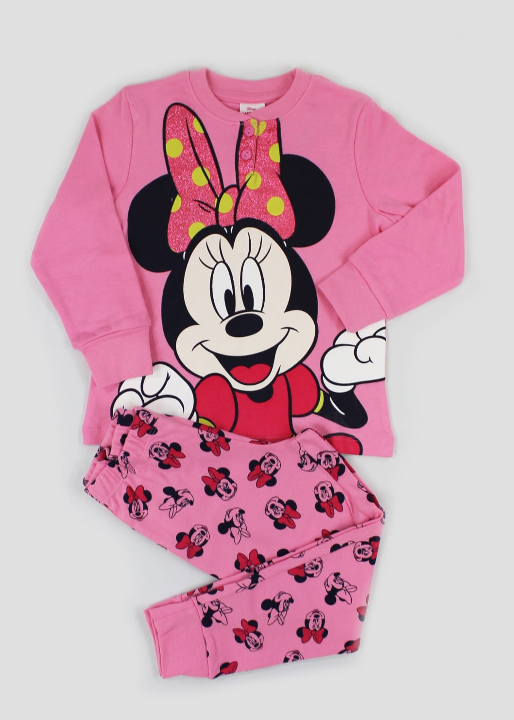 Un pigiama Sabor in 100% caldo cotone con tanti brillantini luminosi e stampa serigrafata raffigurante Minnie. La simpatica amica di Mickey mouse accompagnerà le notti e i momenti in casa della tua bambina, offrendole comodità e calore grazie al tessuto interlock  e alla morbida aderenza su caviglie e polsi.