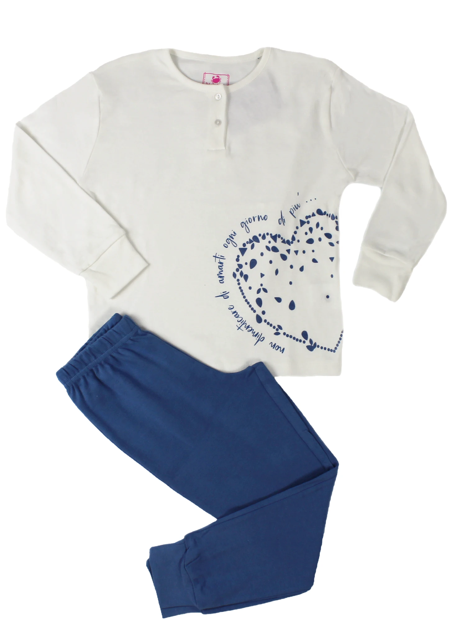 Pigiama bimba in caldo cotone interlock, un cotone a maglia incrociata a trama fitta e sottile, che risulta soffice e avvolgente sulla pelle. Ideale per l’autunno/inverno. La tua bimba potrà godersi un sonno tranquillo, massima libertà di movimento e comodità. La scritta di questo pigiama “Non dimenticare di amarti ogni giorno di più…” è l’augurio più dolce per la tua piccola donna, che l’accompagna ogni notte nei suoi sogni!