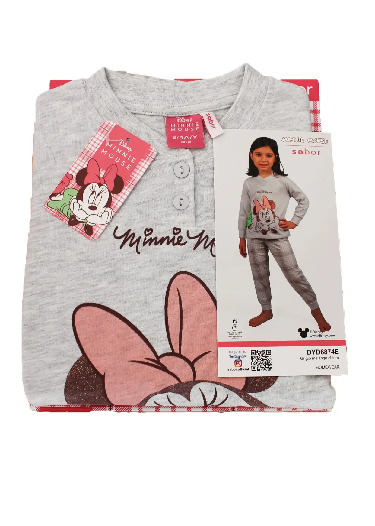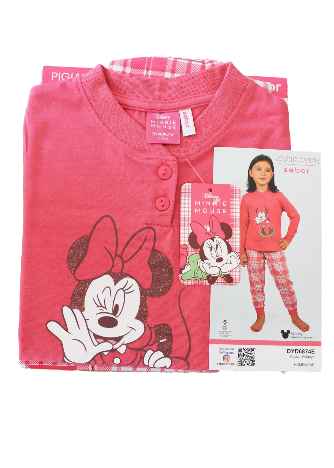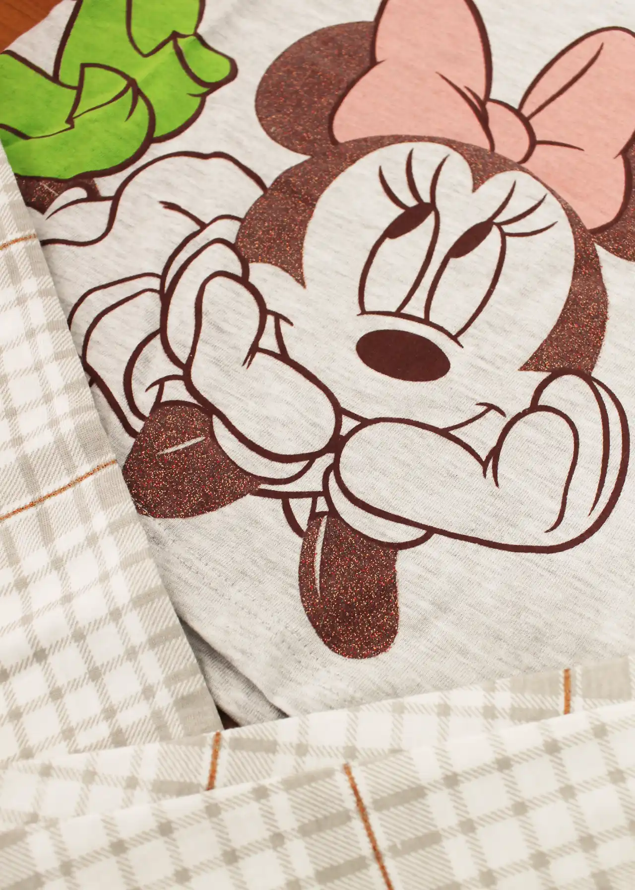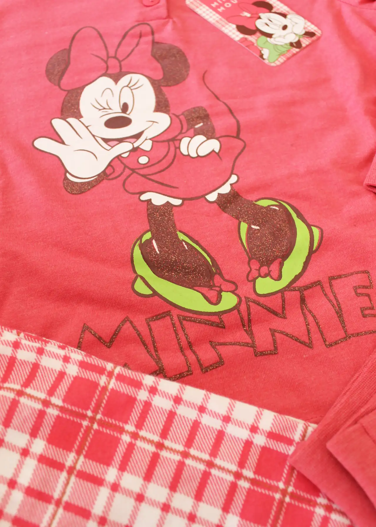 Allegro ed originale, il pigiama è composto da maglia girocollo serafino con 2 bottoncini, manica lunga con polsini decorata con stampa di Minnie lavorata a lamina glitterata e pantalone lungo con polsini alla caviglia a motivo Tartan