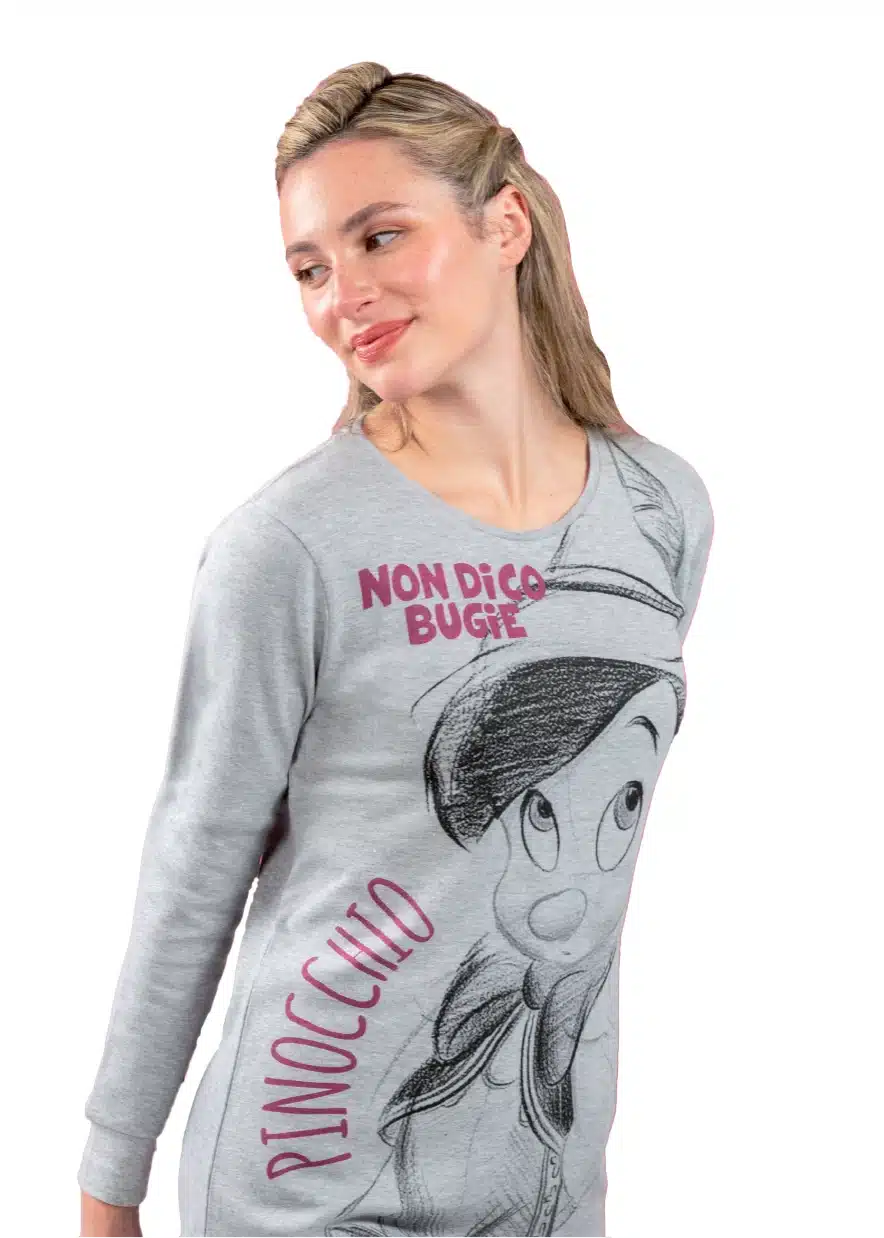 Adatto alla stagione fredda di autunno e inverno e realizzato con tessuti naturali per il massimo del comfort e della sicurezza. Prodotto dal marchio italiano Sabor con alti standard qualitativi. Con stampa di Pinocchio sul frontale della maglia è disponibile nei colori grigio e panna.