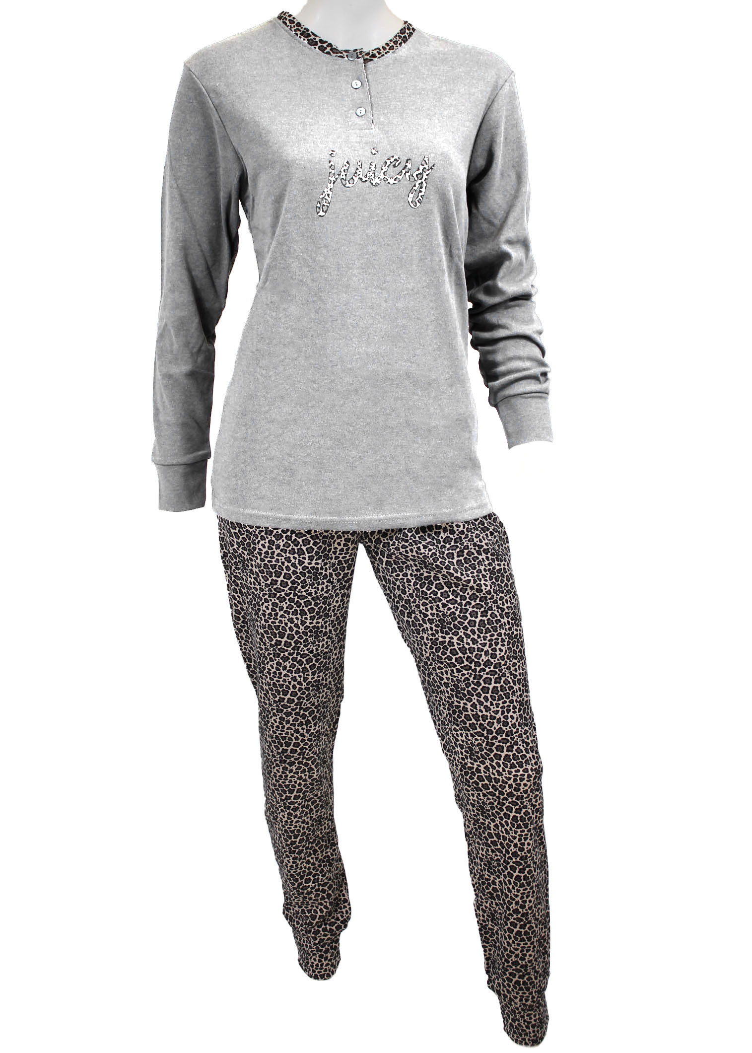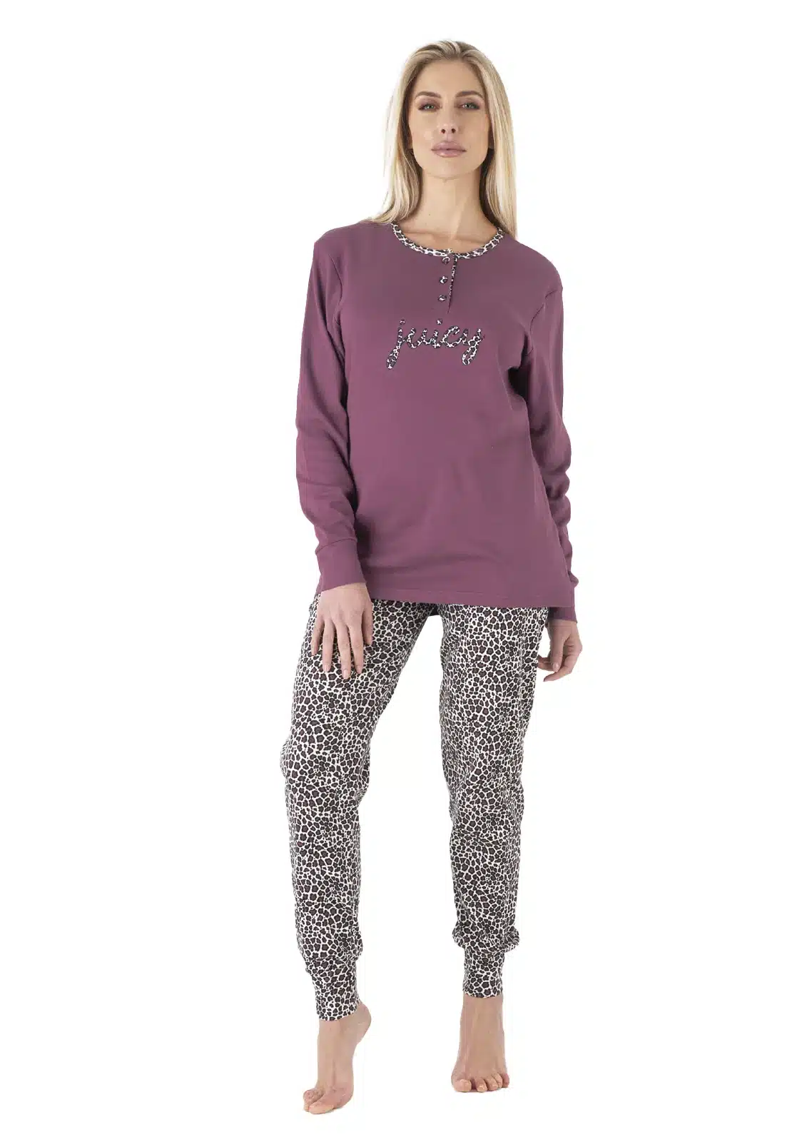 Realizzato in 100% cotone a maglia incrociata interlock , adatto alla stagione più fredda di autunno e inverno. Maglia in tinta unita con applicazioni maculate a tono con il pantalone tutto maculato. Disponibile in taglie maxi 54, 56 e 58.