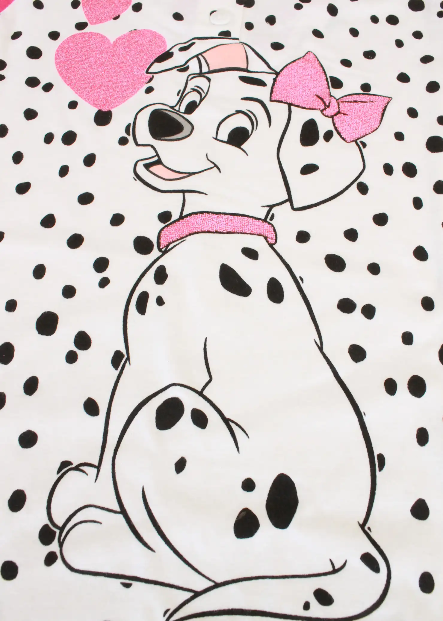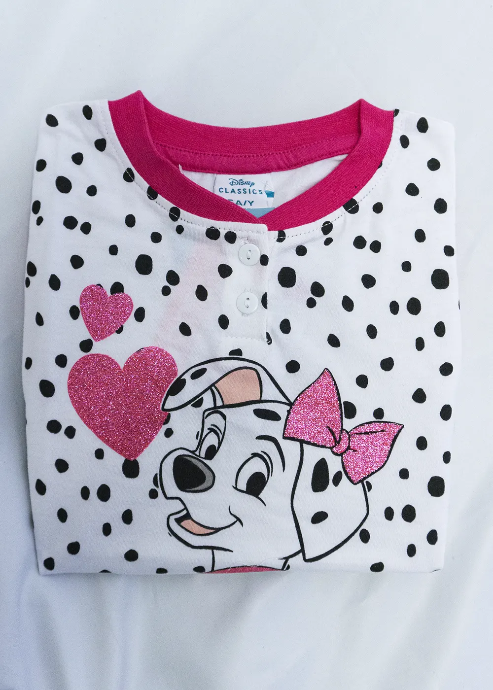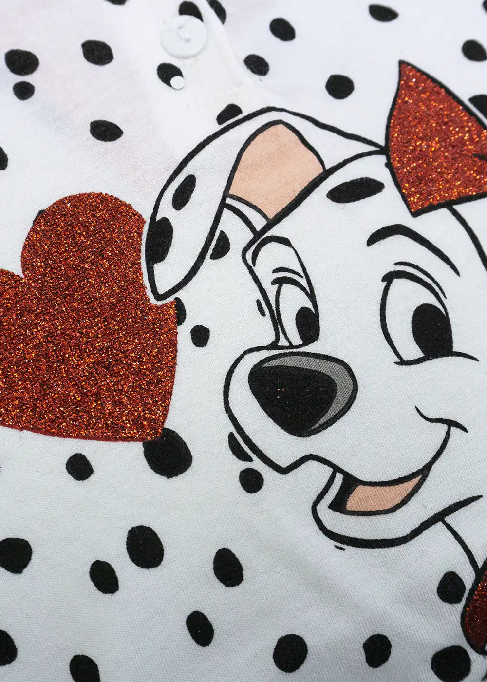Pigiama da bimba di Sabor realizzato in cotone 100%. Fresco e traspirante, è composto da maglia girocollo serafino con 2 bottoncini a mezza manica decorata con stampa di della Carica dei 101 Disney lavorata a lamina glitterata e pantalone corto a tinta unita.