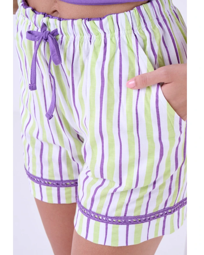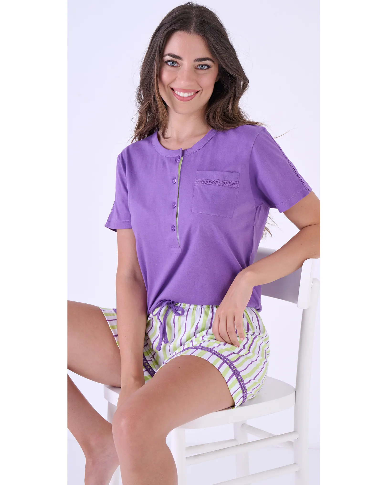 Pigiama donna in mezza manica e pantaloncino corto con tasche e coulisse viene prodotto utilizzando il miglior cotone jersey leggero , che risulta fino e traspirante e si adatta ai periodi più caldi dell’anno.