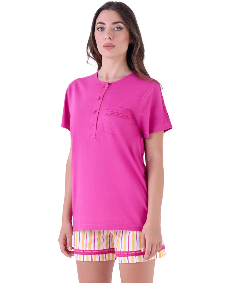 - maglia mezza manica gialla e pantaloncino corto rigato bianco e rosa ;