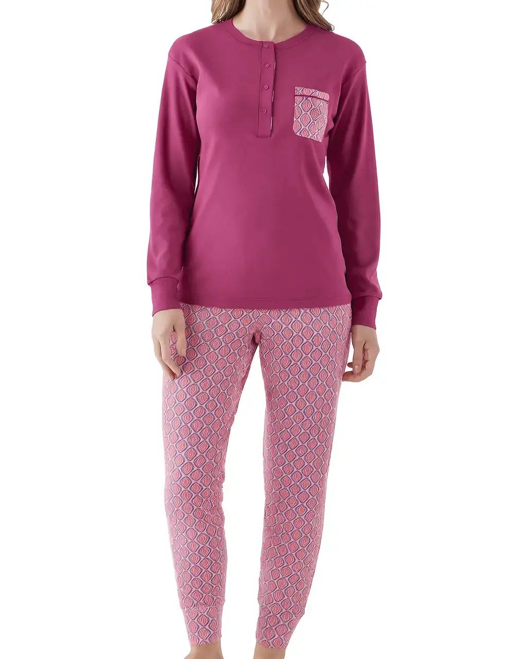 Pigiama donna Pigiamiamoci in caldo cotone interlock, 100% cotone naturale. Maglia serafino con taschino fantasia e pantalone con polsini. Colori prugna e verde.