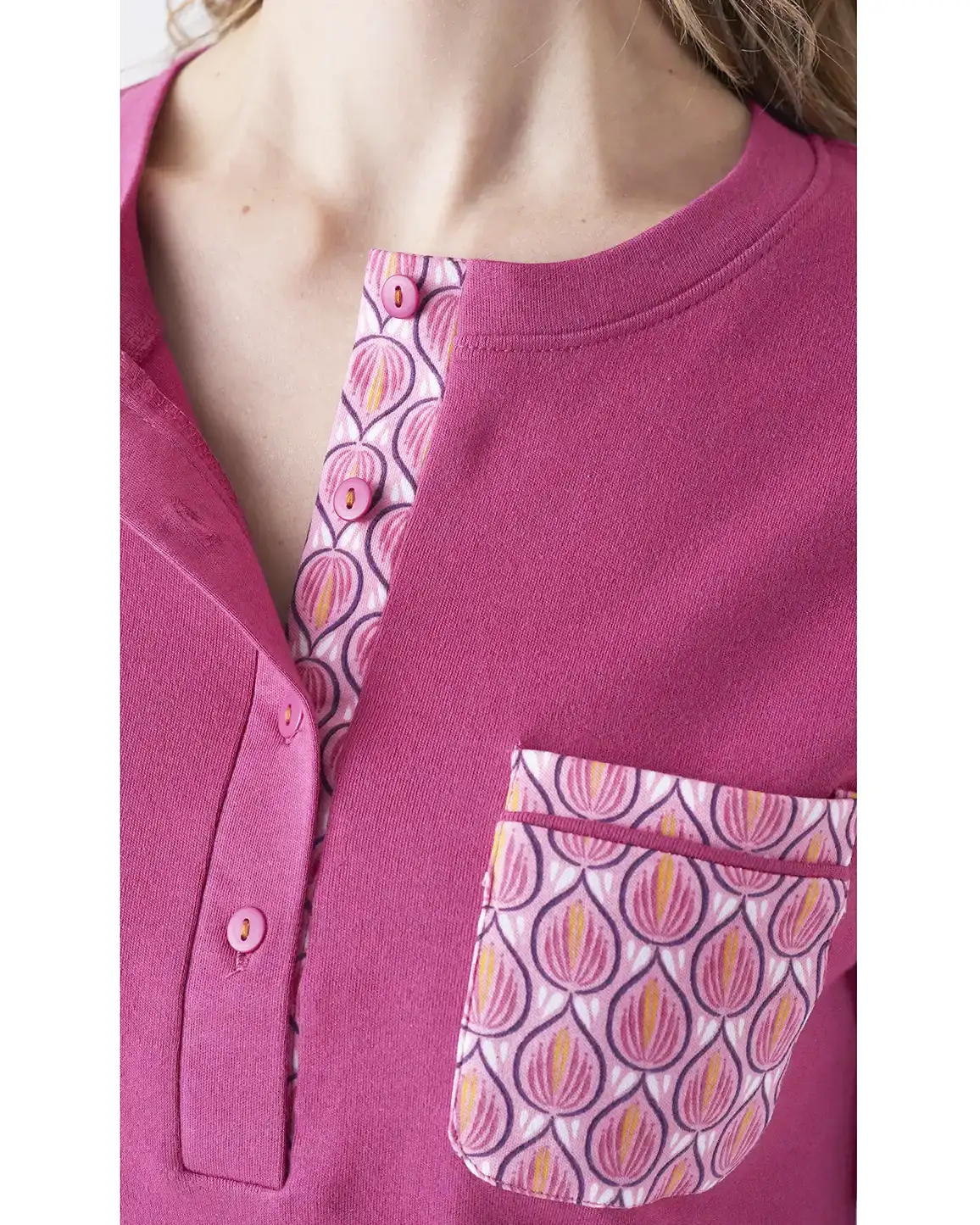 La maglia a serafino con bottoni e taschino fantasia coordinato aggiunge un dettaglio raffinato e femminile, mentre il pantalone con polsini alla caviglia garantisce una vestibilità perfetta e una sensazione di benessere totale.
