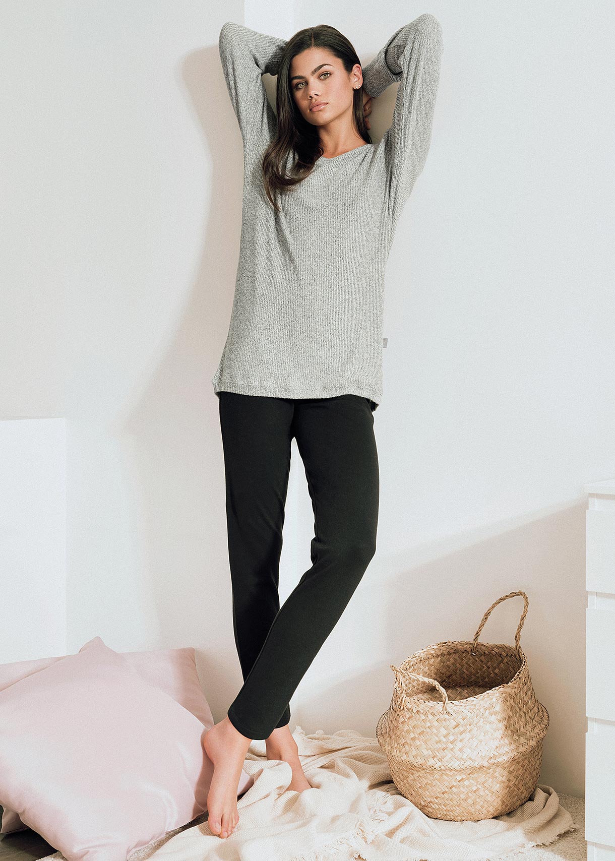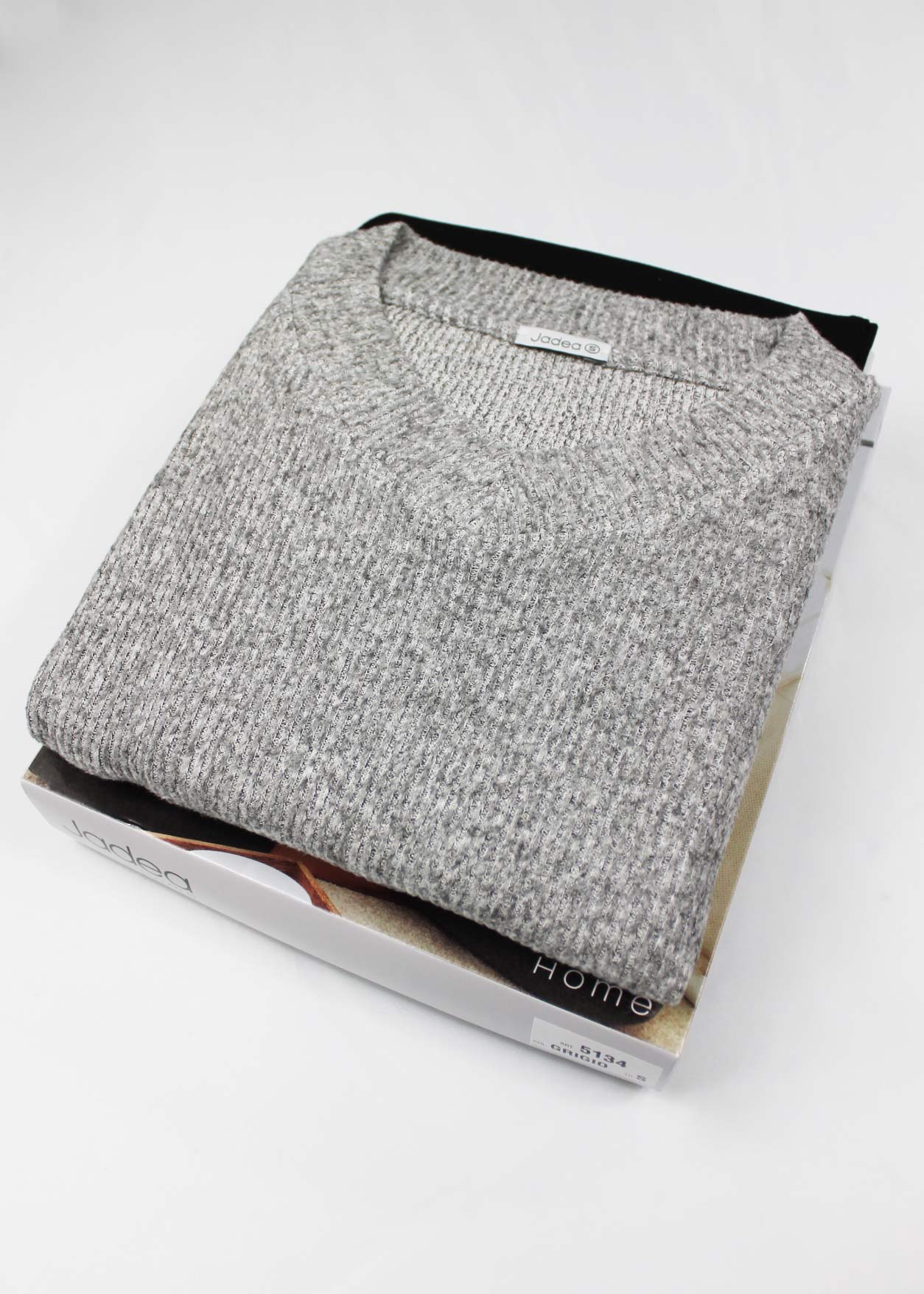 Pigiama donna della collezione Jadea Home, composto da maglia con scollo a V e manica lunga con polsini, realizzata in tessuto a costine ad effetto melange e pantalone in caldo cotone interlock, tessuto a maglia incrociata con trama fitta e sottile che conferiscono al capo particolari caratteristiche di compattezza e calore.