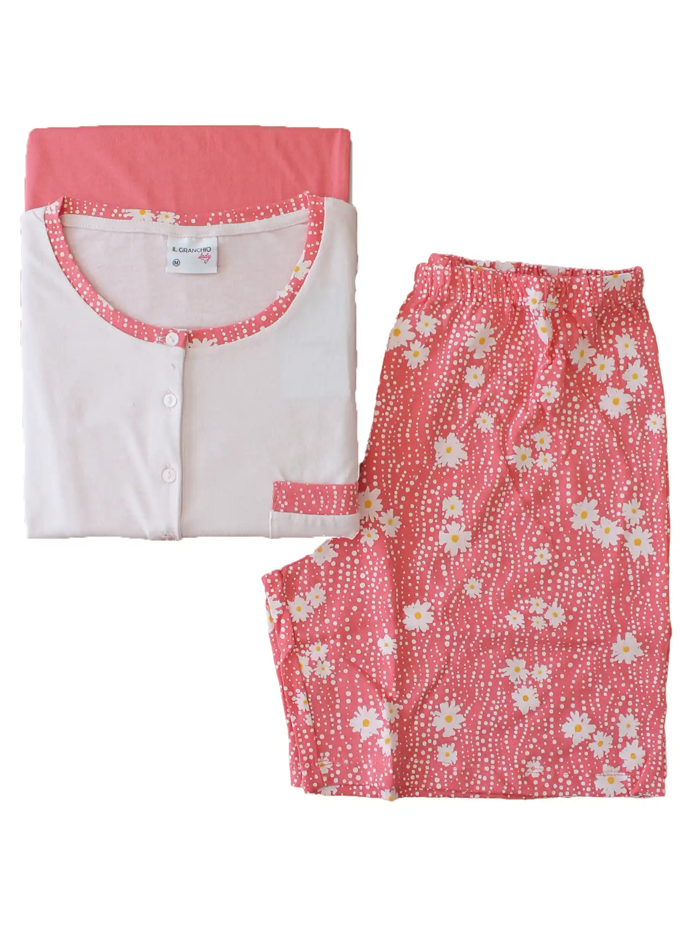 Composto da maglia dal taglio dritto, girocollo modello serafino con tre bottoncini rifinito da bordura in tessuto a stampa di fiorellini, taschino laterale e pantalone in due diverse lunghezze: lungo, a tinta unita con morbido bordo elastico alla caviglia e corto, a stampa di fiorellini in tinta con le rifiniture di colletto taschino