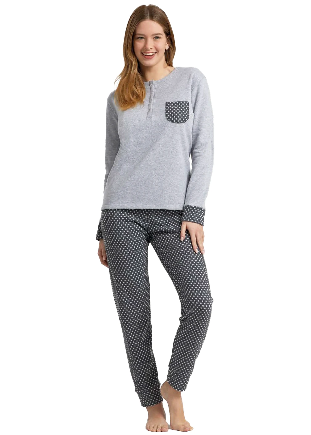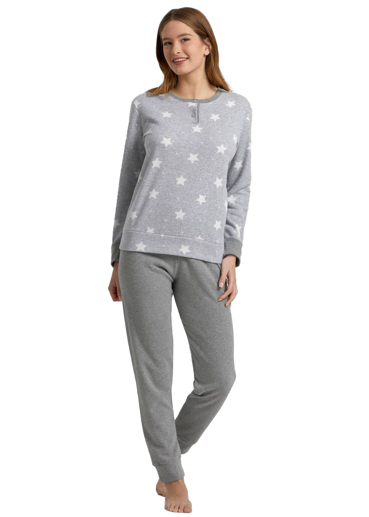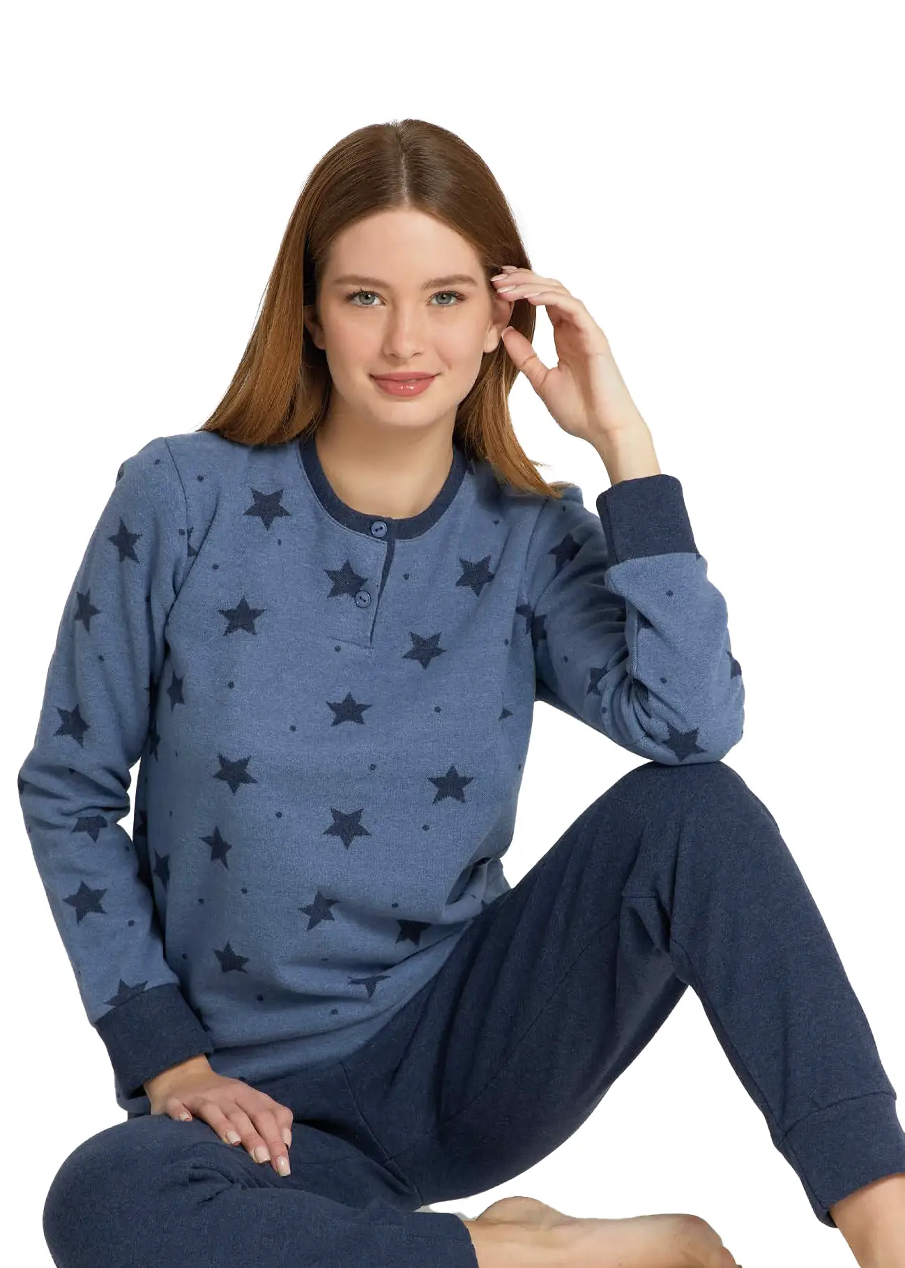 Realizzato in felpa punto Milano molto calda e morbida sulla pelle. Adatto ai periodi più freddi dell’anno. Maglia a maniche lunghe con stampa stellata, polsini e taschino decorativo sul petto. Pantaloni senza coulisse e con fasce sulle caviglie.