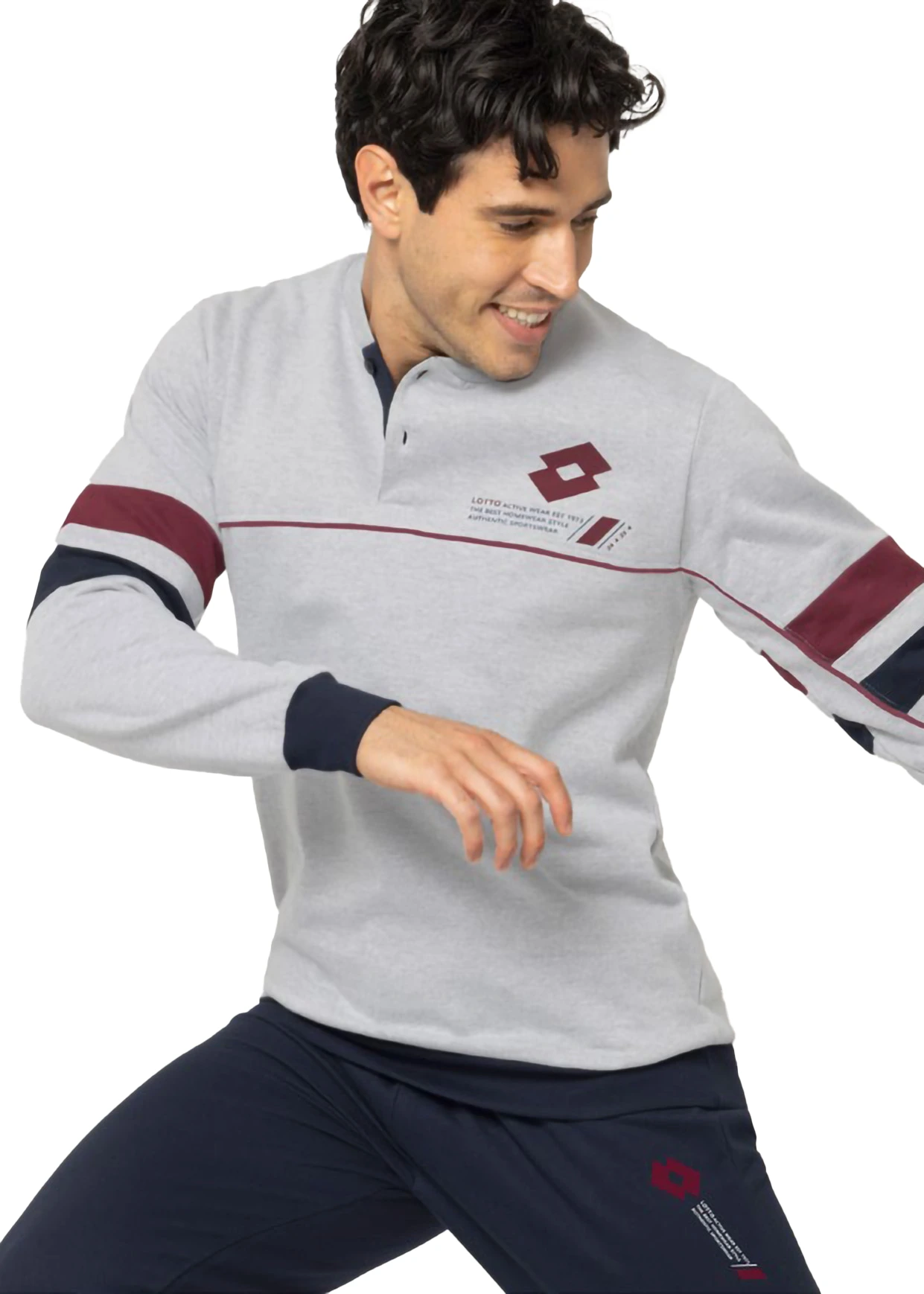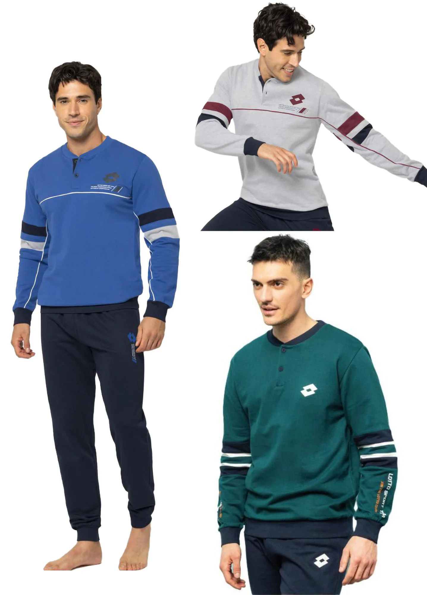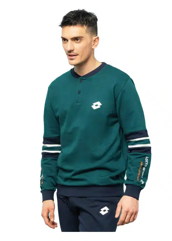 Adatto alla stagione fredda e a chi piace vestire con lo stile sportivo che Lotto propone da sempre. Colletto a giro con due bottoncini, fasce elastiche su polsi e caviglie. Disponibile nei colori Jeans e verde Bosco, Bluette e Grigio