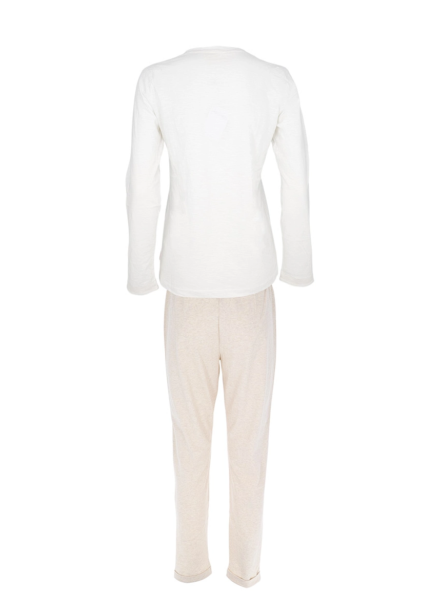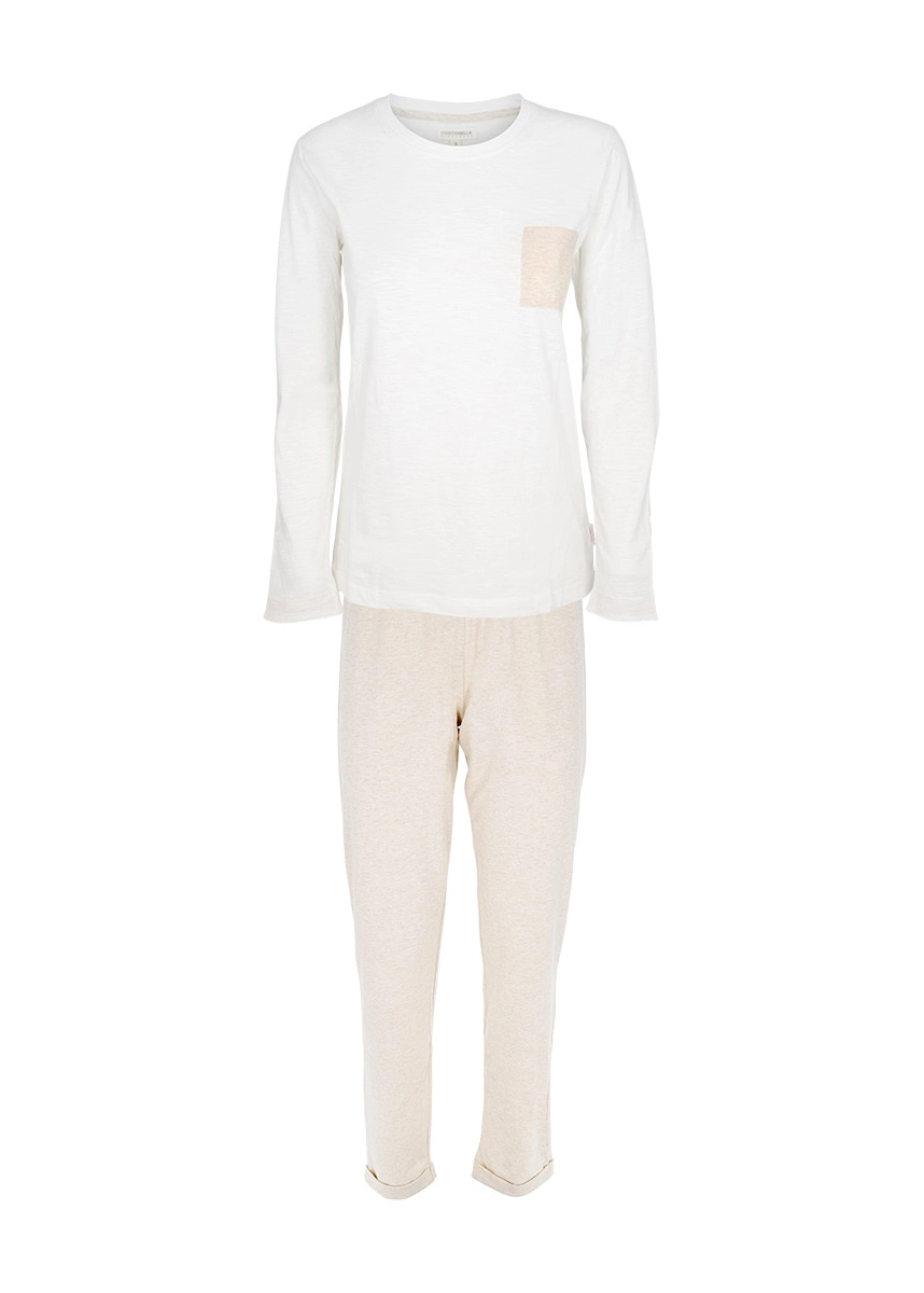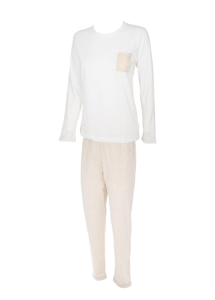 Composto da casacca girocollo a manica lunga, inserti color beige su polsi e taschino laterale e pantalone lungo con morbido bordo elastico in vita.