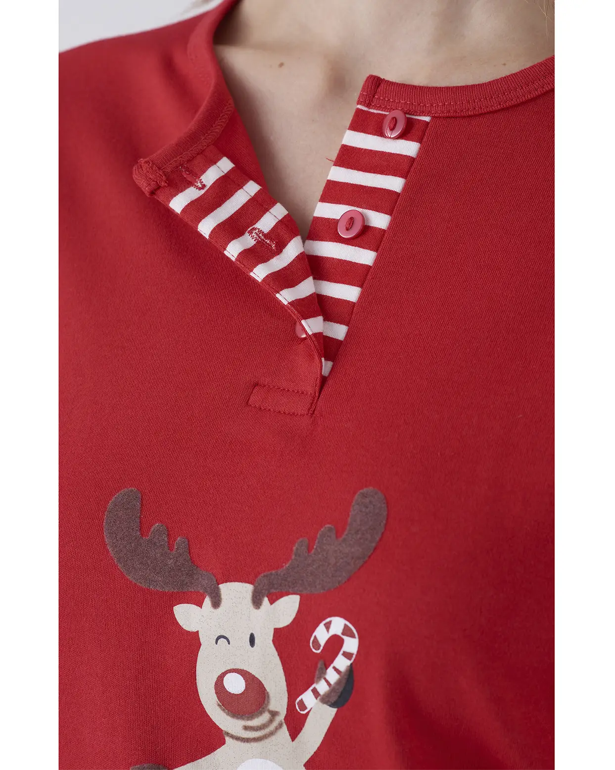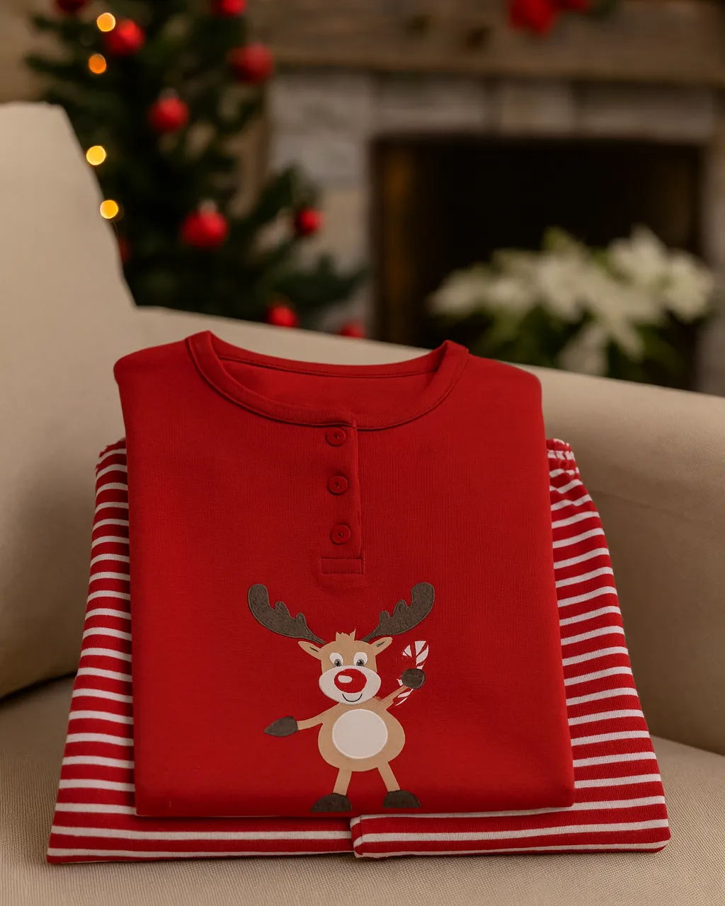 La maglia rossa con bottoncini presenta una dolce stampa natalizia con renna, mentre il pantalone a righe bianche e rosse aggiunge un tocco festoso e divertente.