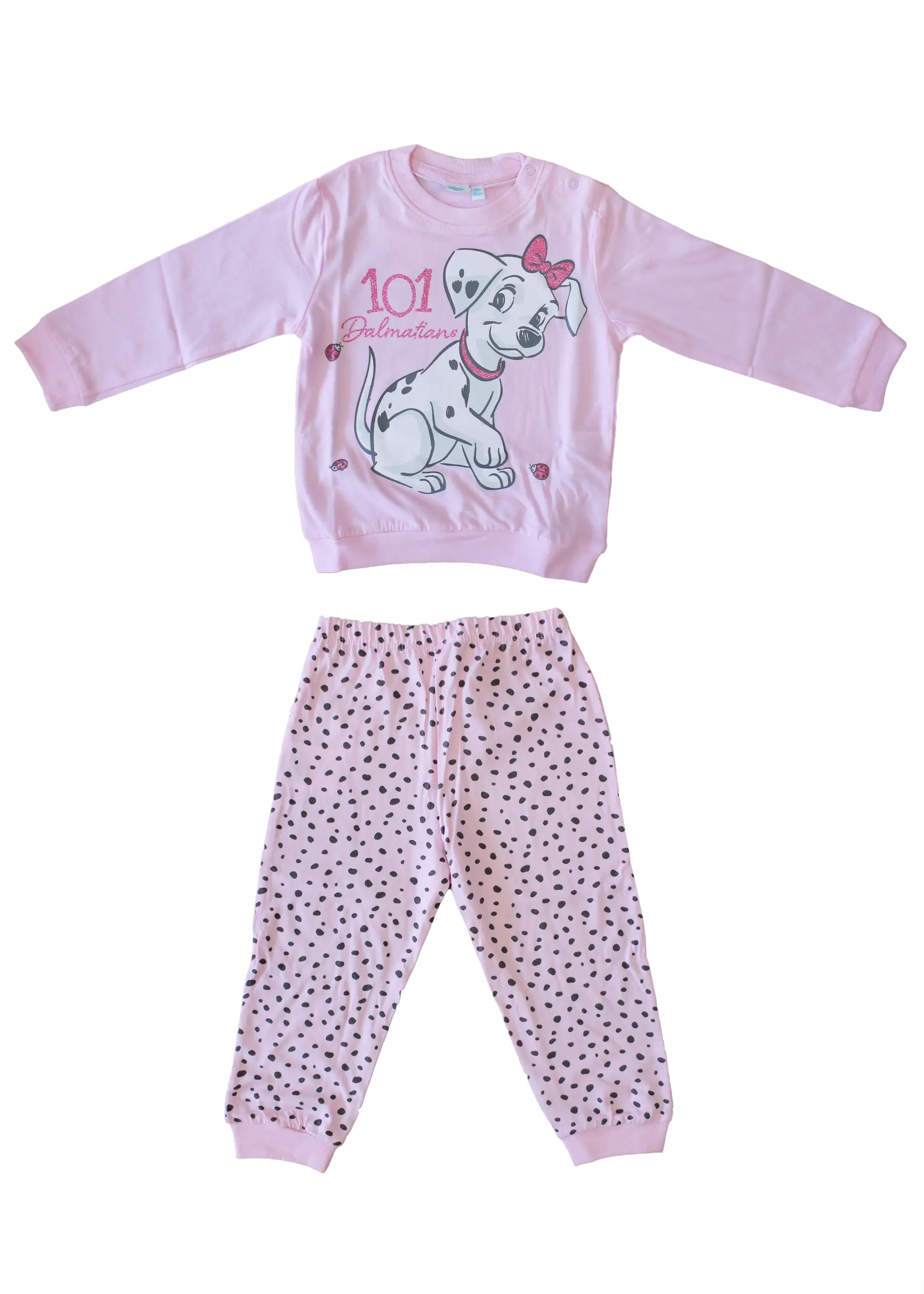 Composto da maglia girocollo decorata con stampa raffigurante un dolce dalmata e scritta “101 Dalmatians”, con glitter rosa, maniche lunghe con bordo elastico al polso decorate a macchie di dalmata stampate, e pantalone con polsini elastici alla caviglia decorato a macchie di dalmata stampate.