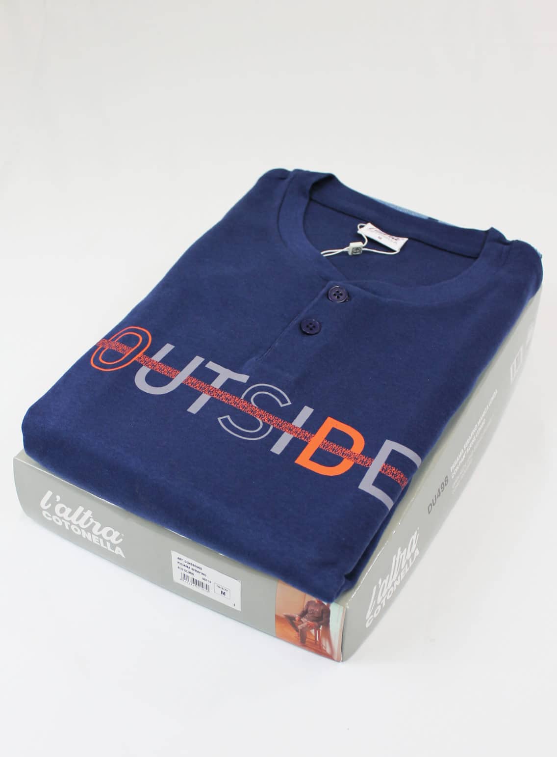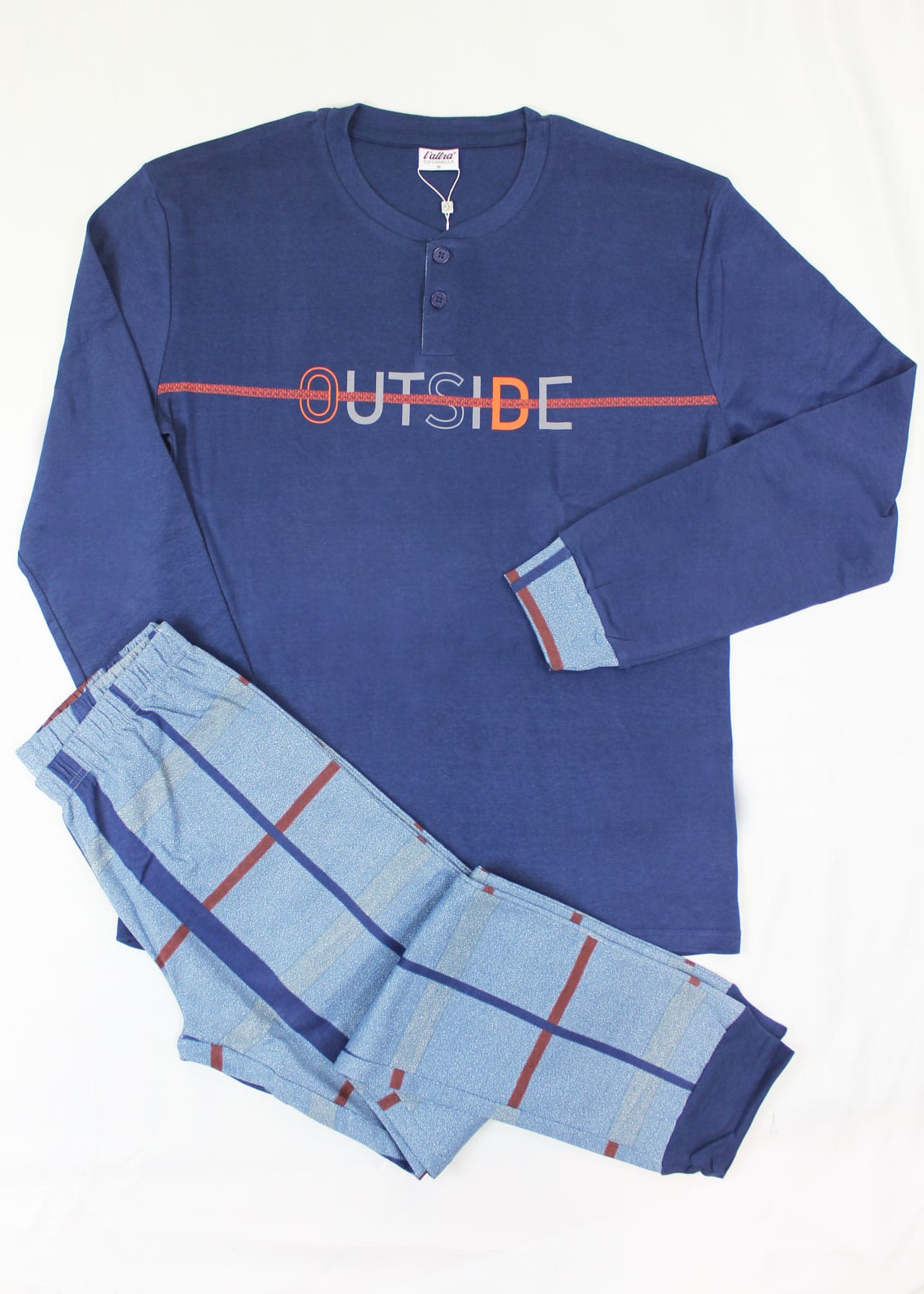 Composto da maglia girocollo con 2 bottoni e manica lunga con polsino nella stessa fantasia del pantalone e stampata con la scritta “Outside” e pantalone lungo stampato con linee incrociate con polsino alla caviglia.