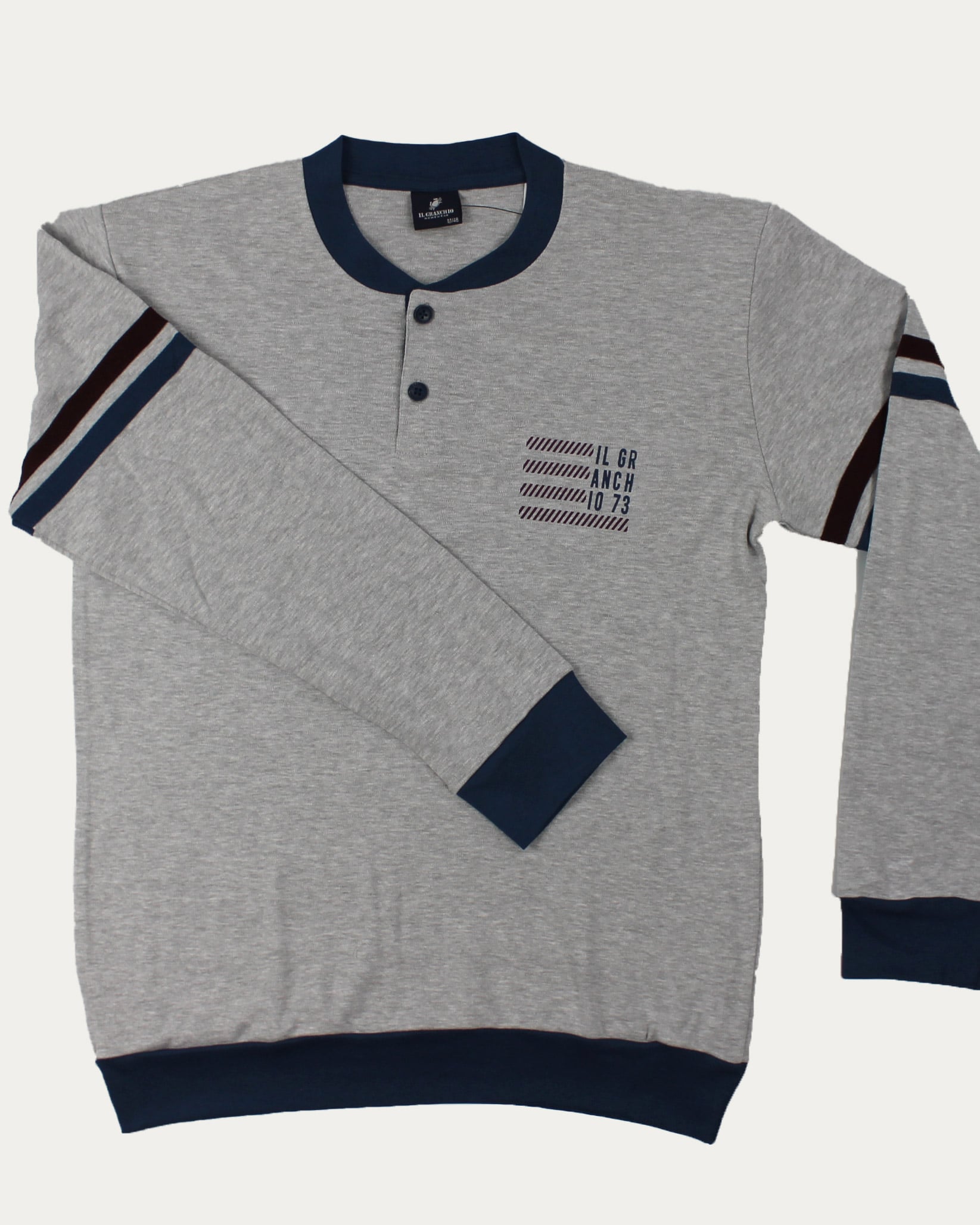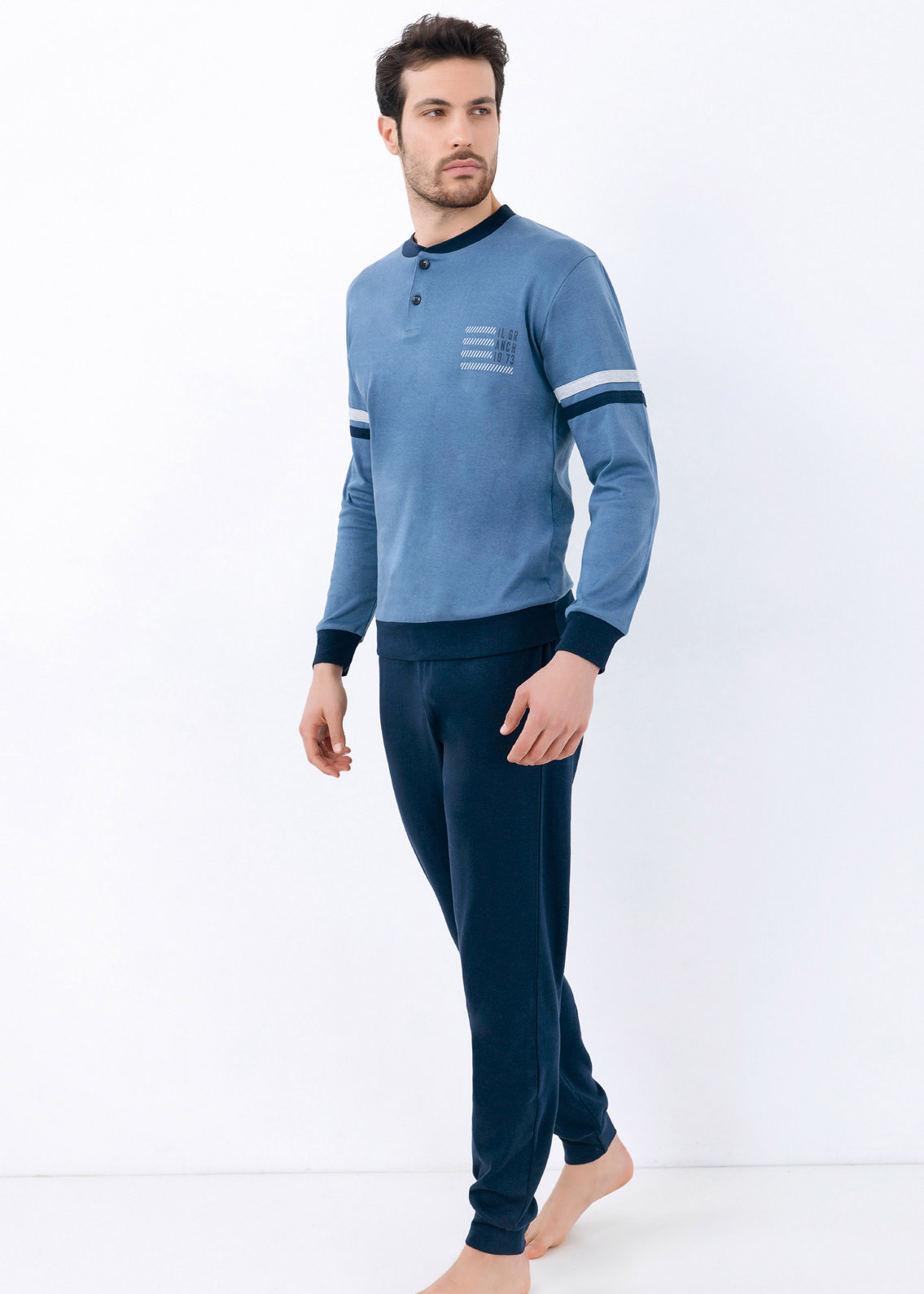 Pigiama uomo Il Granchio realizzato in caldo cotone interlock, un cotone a maglia incrociata a trama fitta e sottile che risulta soffice e avvolgente sulla pelle, ideale per i periodi meno caldi. Di eccezionale comodità e vestibilità, composto da maglia girocollo con 2 bottoni e bordo elastico sui polsi e sul girovita decorata con bande orizzontali sulle maniche e pantalone comodo con fascia morbida ed elastica su caviglie e girovita.