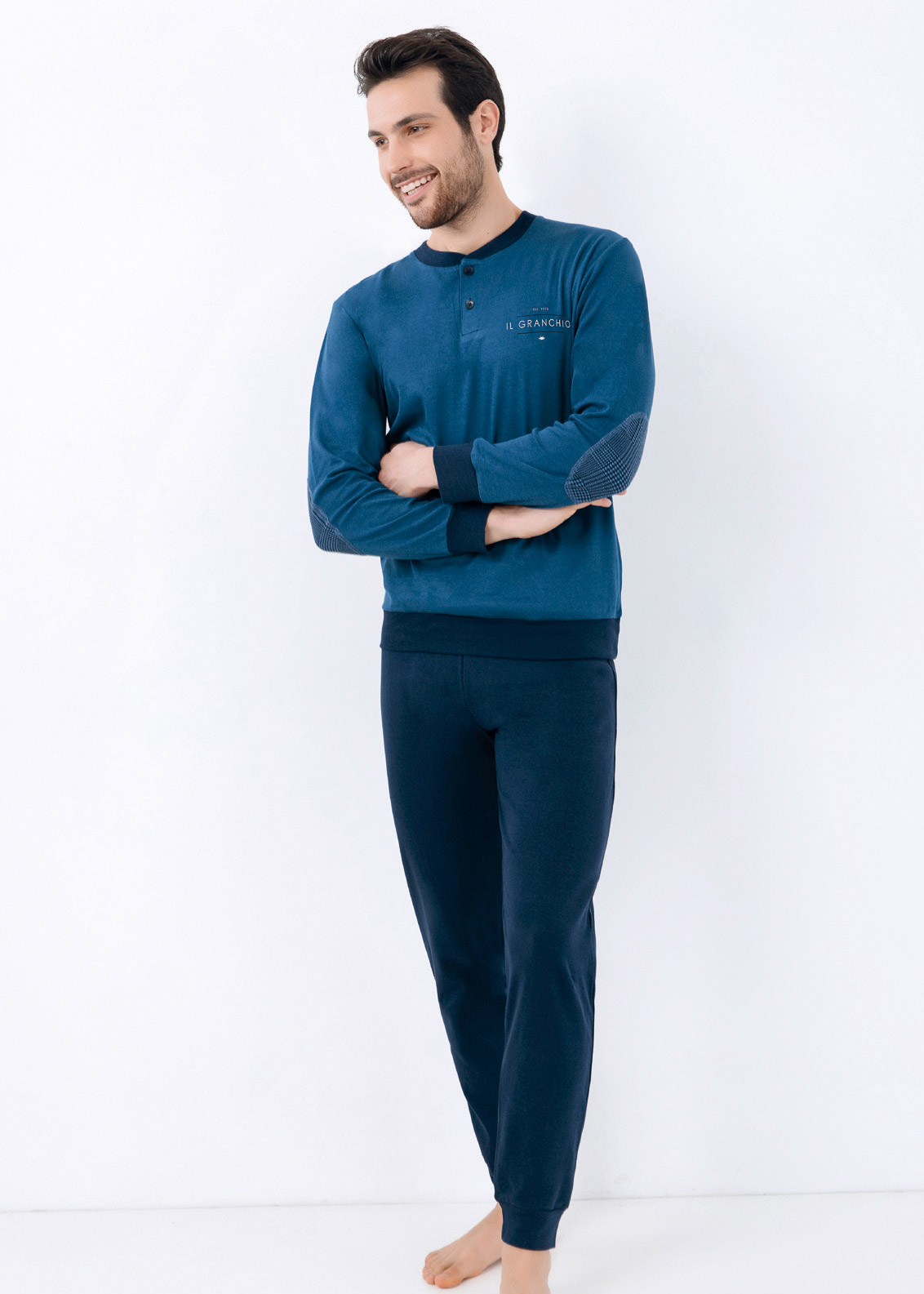 Caldo e avvolgente, il Pigiama è composto da maglia girocollo modello serafino con fondo a tinta unita, patch su gomiti con stampa tartan, bordi di tono più scuro su girovita, polsi e girocollo e Pantalone a tinta unita con bordo elastico su girovita e caviglie.