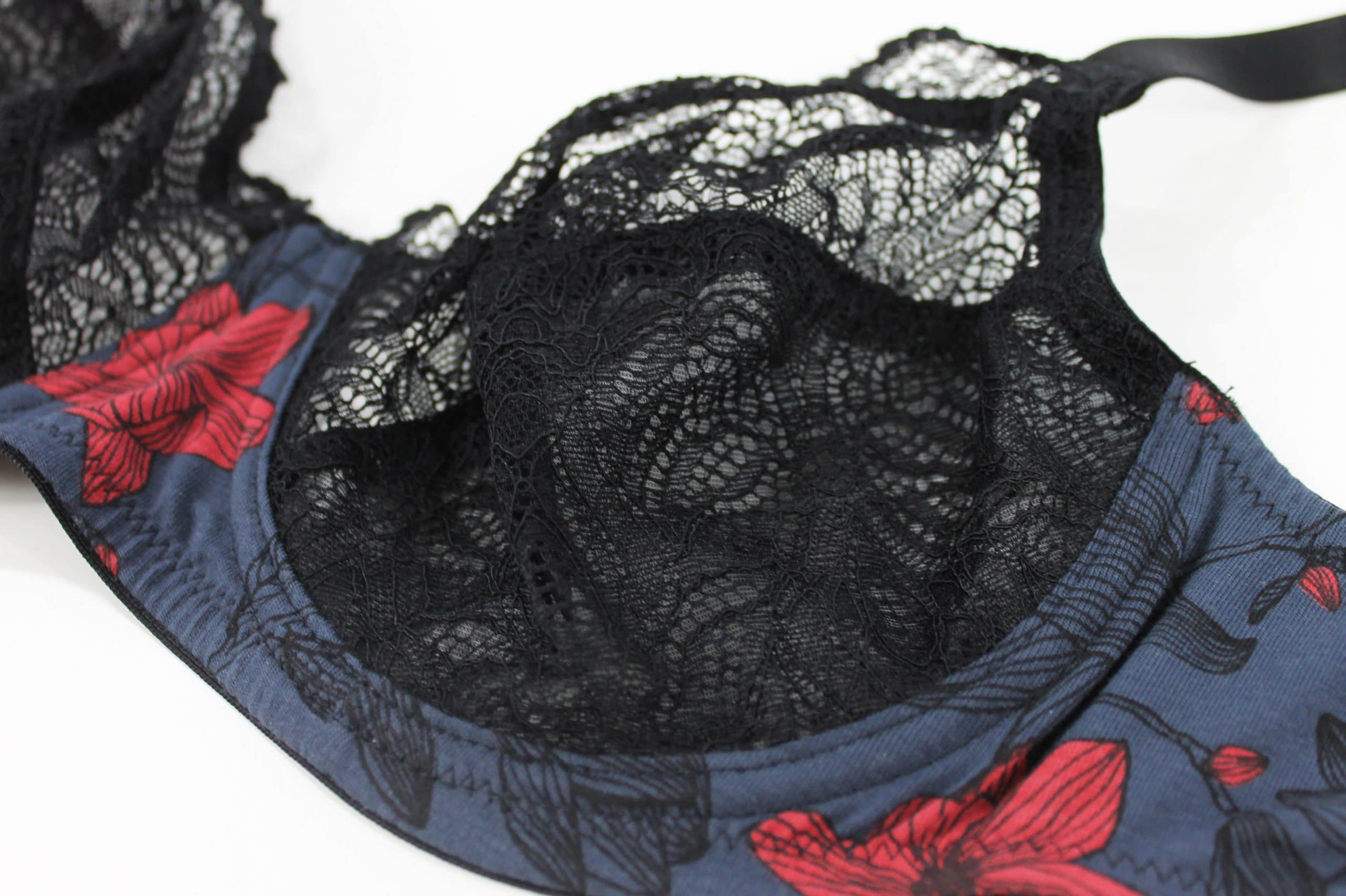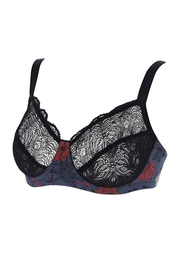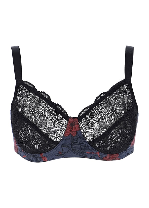 Colori disponibili: Grigio scuro con stampa floreale in nero e rosso, pizzo nero.