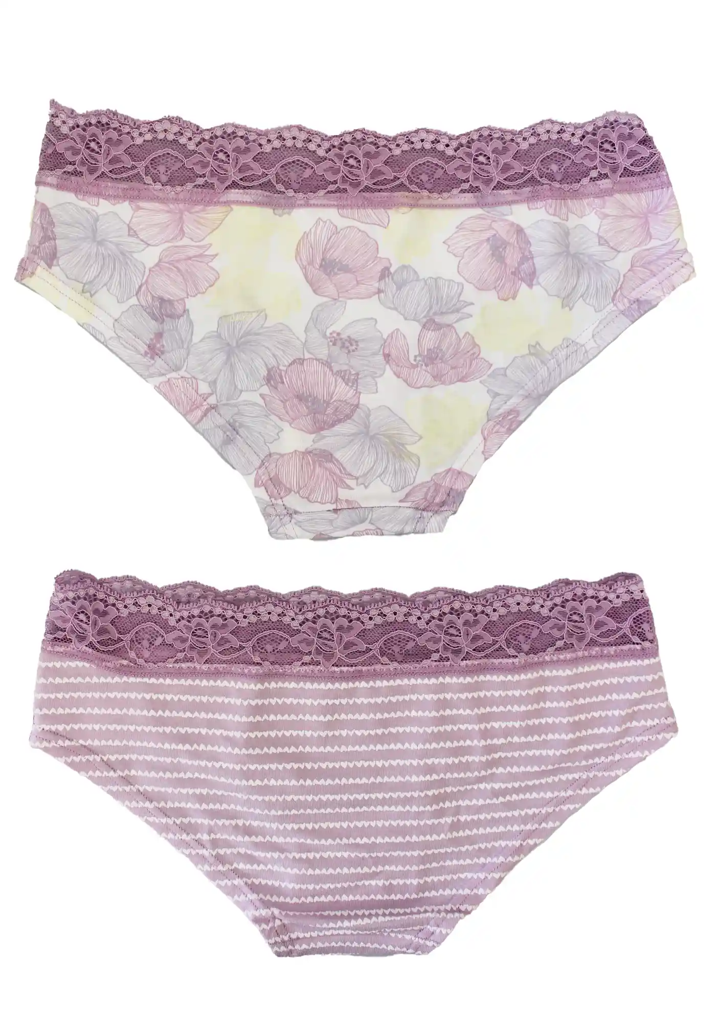 Coppia di slip in cotone bielastico di Cotonella con stampa floreale e pizzo lungo il girovita e a fantasia geometrica lineare con pizzo
