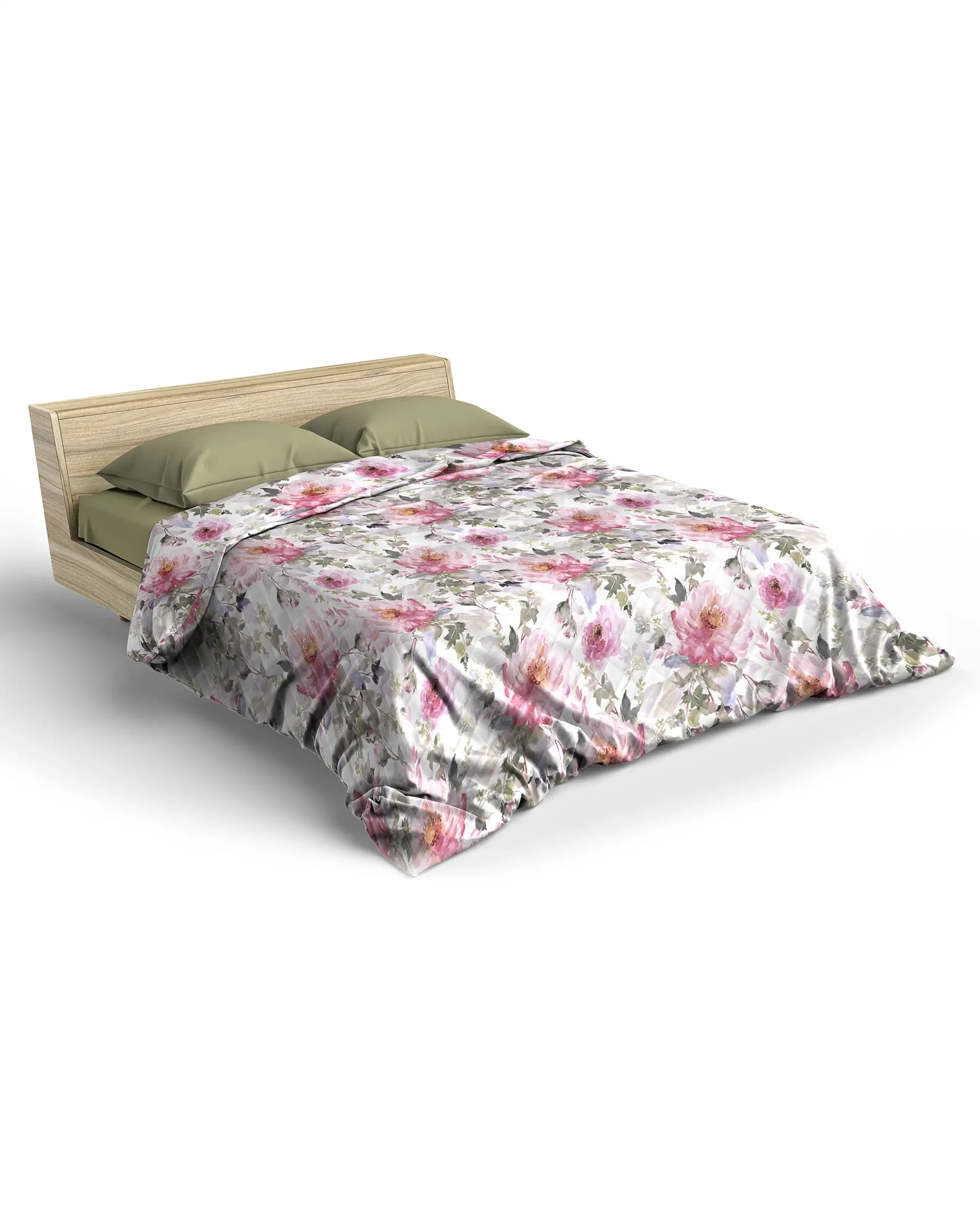 Trapuntino Matrimoniale Acquerello di Lovely Shabby, decorato con stampe a fantasia floreale di rose viola e rosa dal fondo grigio. Colori scintillanti della primavera.