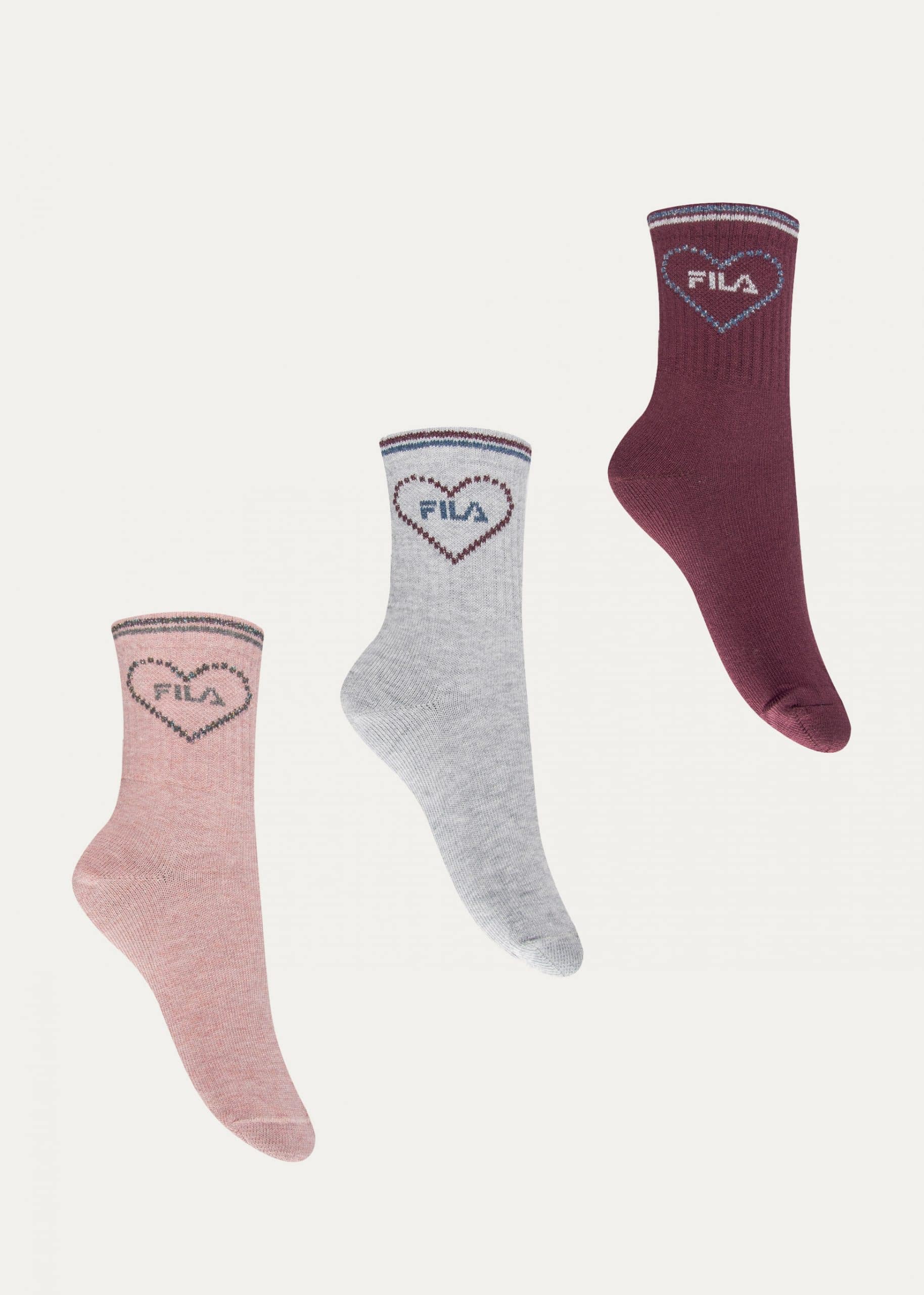 Tris di calzini da bambina Fila, caldi e confortevoli.  Realizzati in n caldo cotone elasticizzato, morbido tessuto in fibra naturale che offre ottima traspirabilità e adattabilità al piede.