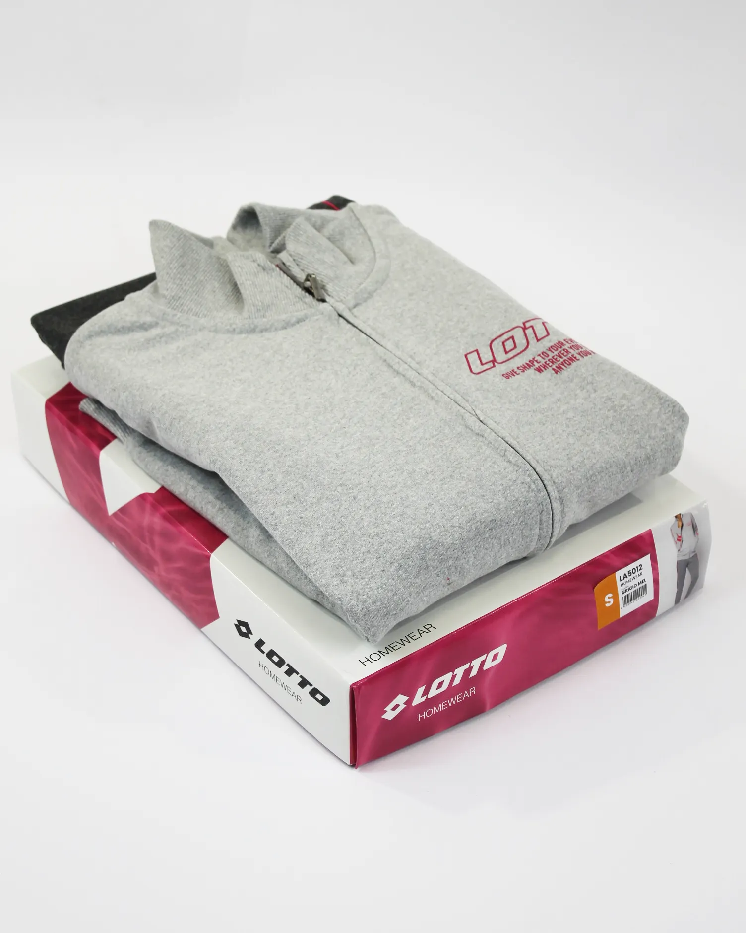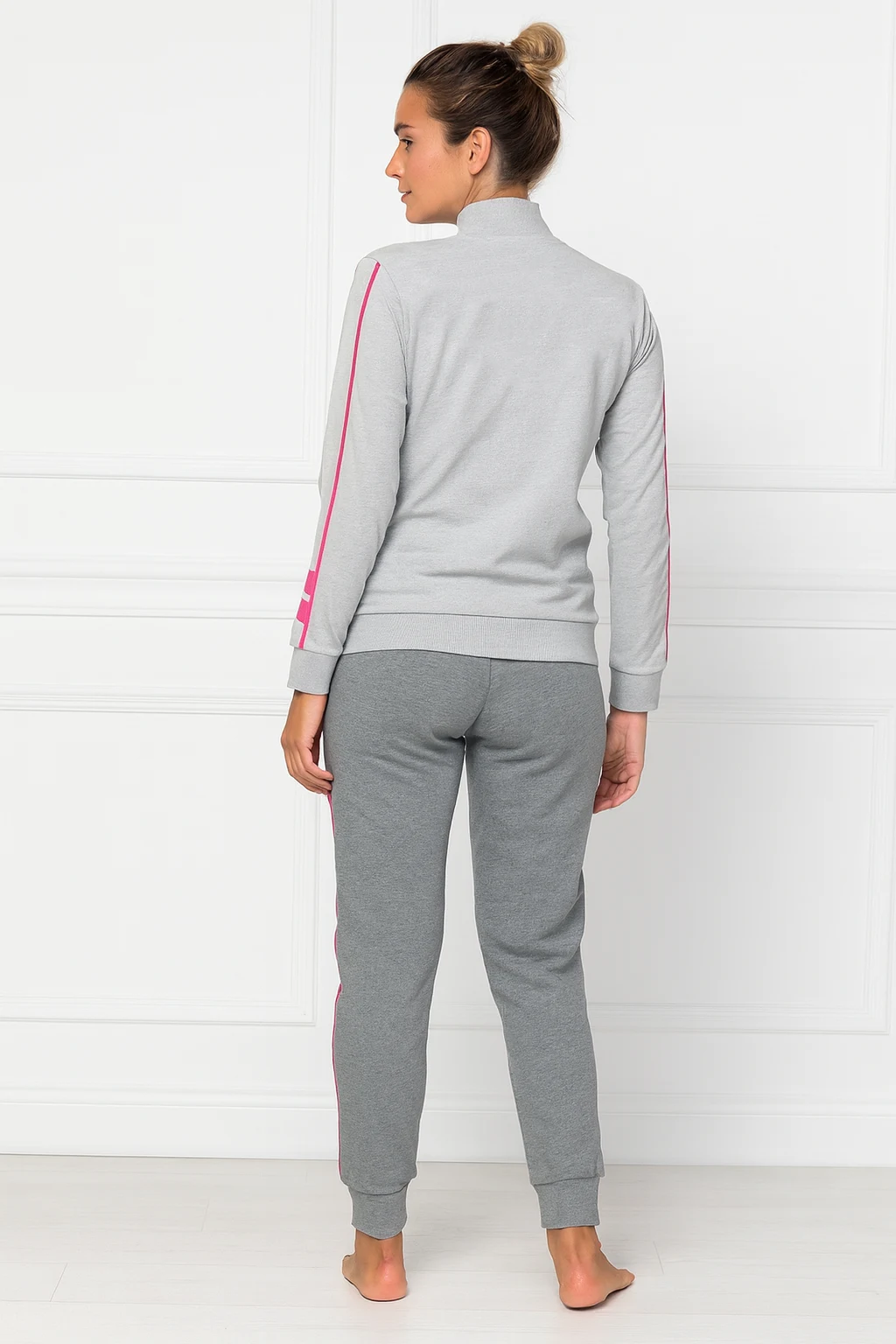Ben realizzata con tessuto fresco in cotone e leggera garzatura interna, giacchetto con tasche laterali e zip intera, rifinito con applicazioni di tessuto a contrasto di colore fucsia | Pantalone in tinta con la maglia (più scuro nel modello grigio) e riga di tessuto a contrasto cucita longitudinale al pantalone.