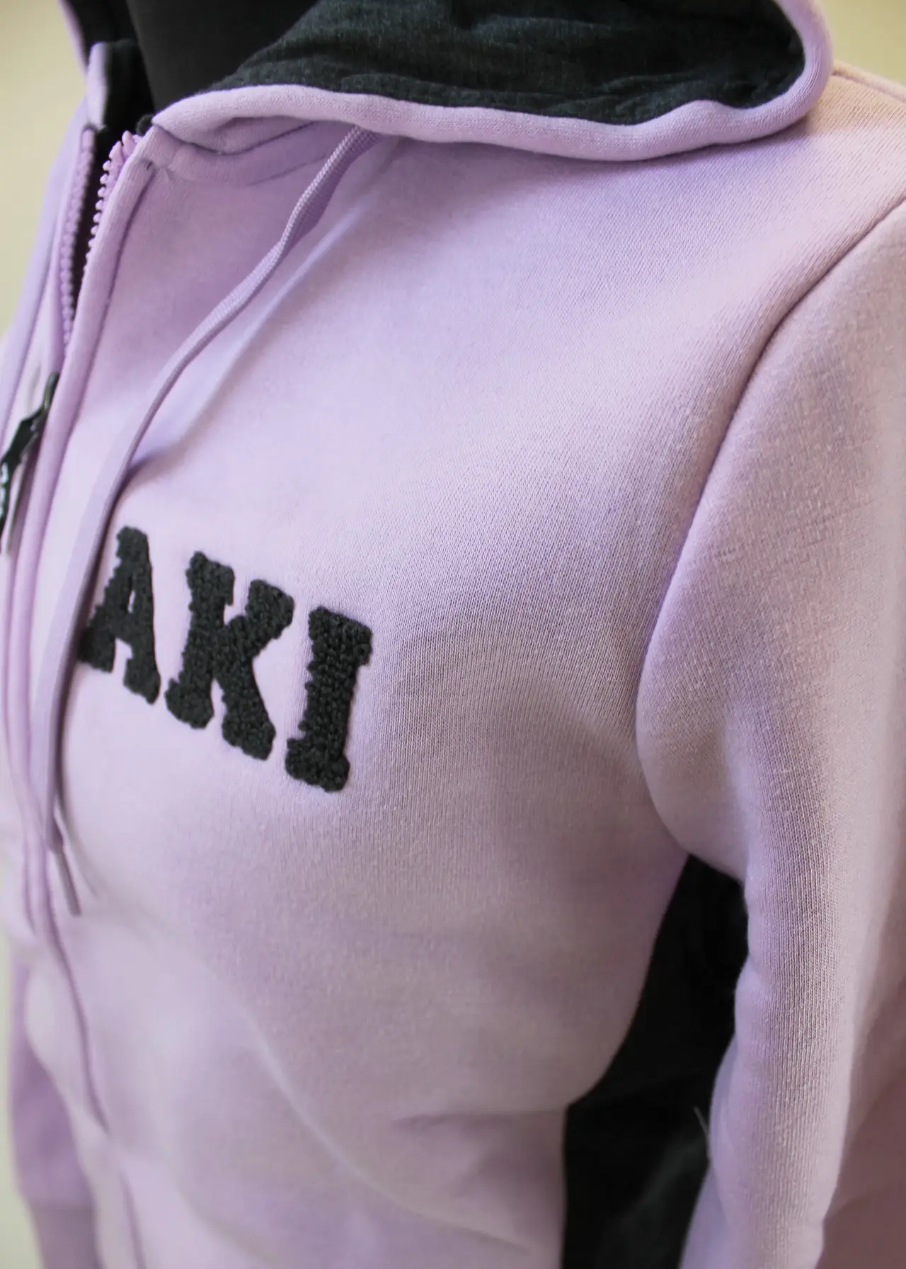 Il completo è composto da giacca lilla con cappuccio dall’interno in tinta con il pantalone, apertura full zip sull’intera lunghezza, maniche con polsini elasticizzati con trama a costine, tasche laterali ed elastico a costine sul fondo e pantalone lungo a tinta unita di color grigio topo melangiato, con banda elastica regolabile su girovita con coulisse e laccetto in tinta con la giacca regolabile, tasche laterali e polsini elasticizzati alla caviglia con trama a costine.