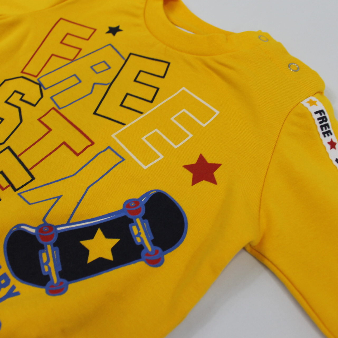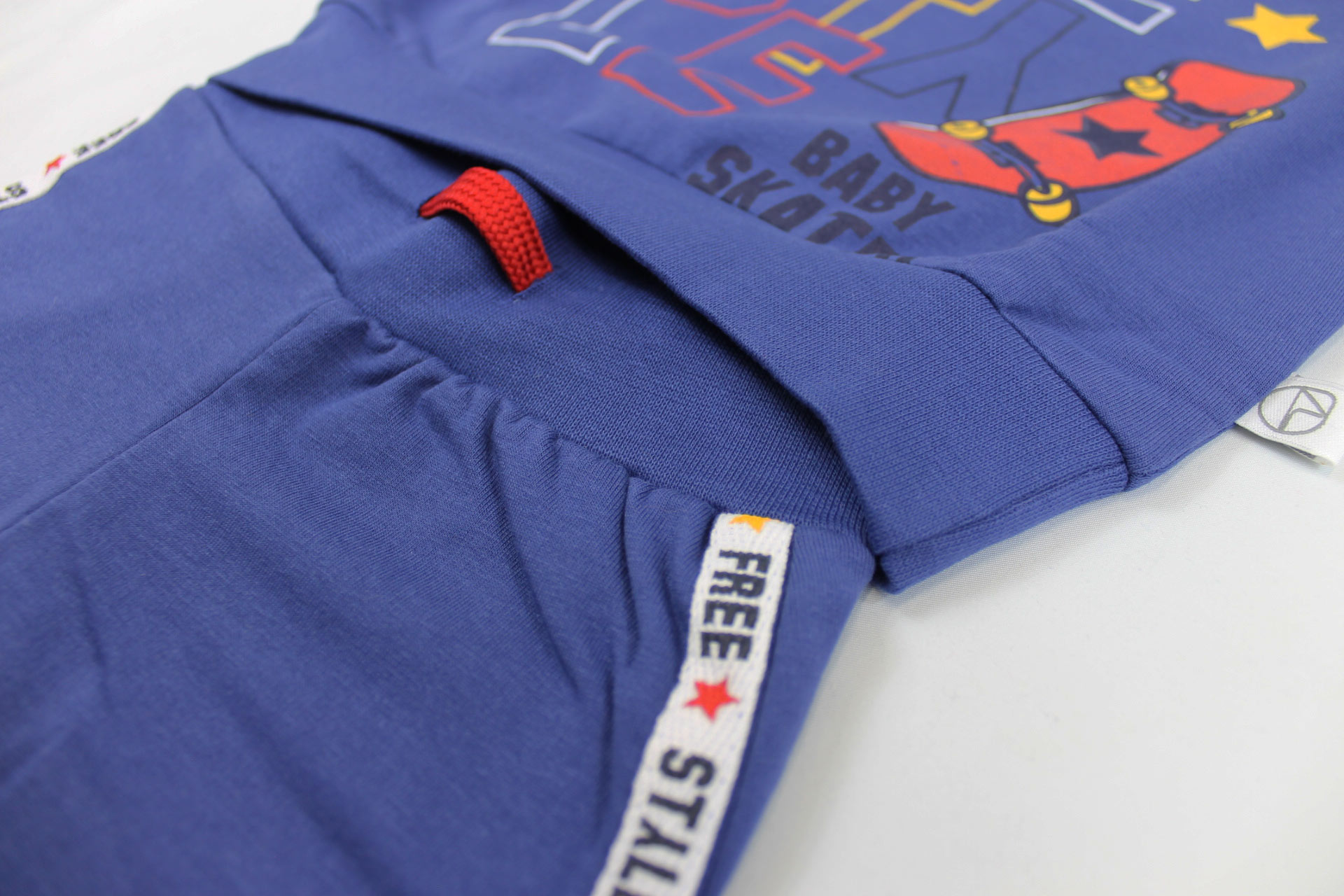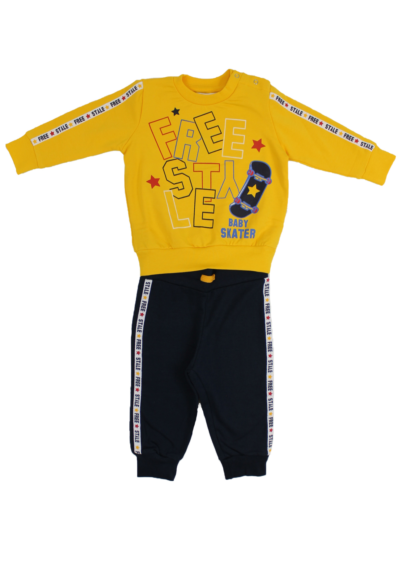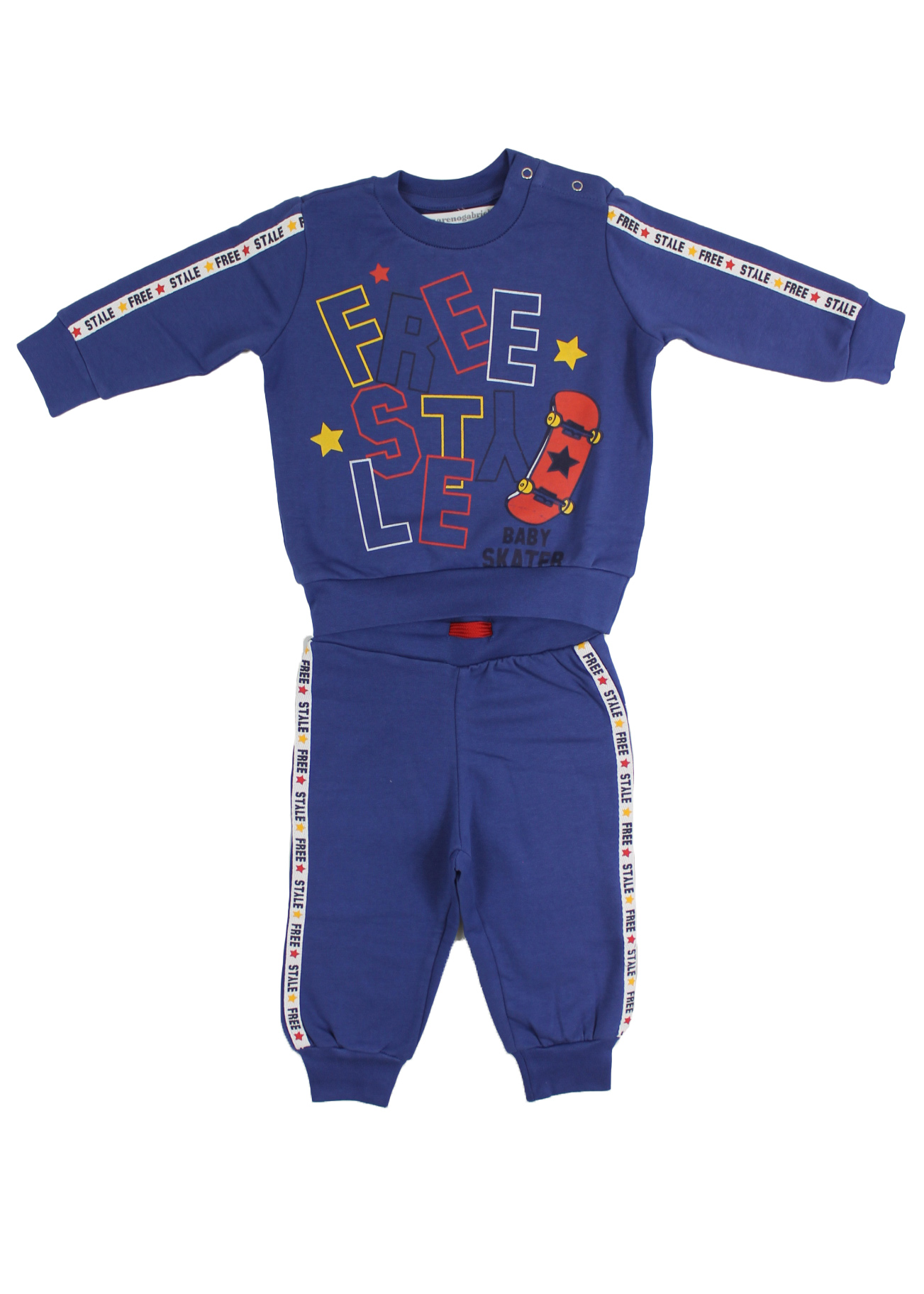Tuta di produzione italiana della collezione neonato Nazareno Gabrielli, realizzata con tessuti di qualità superiore e minuziosa attenzione nelle rifiniture. Dallo stile originale e divertente, questo modellino è indicato per bimbi dai 12 ai 36 mesi ed è realizzato in caldo cotone felpato, composto da due pezzi con bande laterali su pantalone e maniche e la scritta “Free Style” sulla maglia che accompagna un piccolo skateboard.