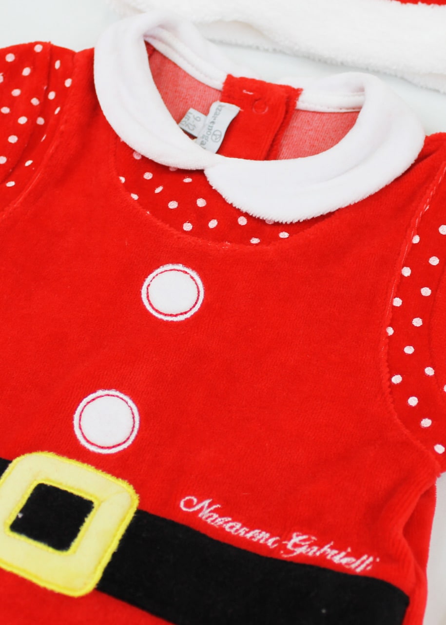 Tutina natalizia di produzione italiana della collezione neonato Nazareno Gabrielli, realizzata con tessuti di qualità superiore e minuziosa attenzione nelle rifiniture, pone un morbidissimo cotone a contatto con la pelle e soffice ciniglia all’esterno. Dallo stile originale e divertente, questo modellino è una tenera riproduzione per neonate dell’abito di Babbo Natale