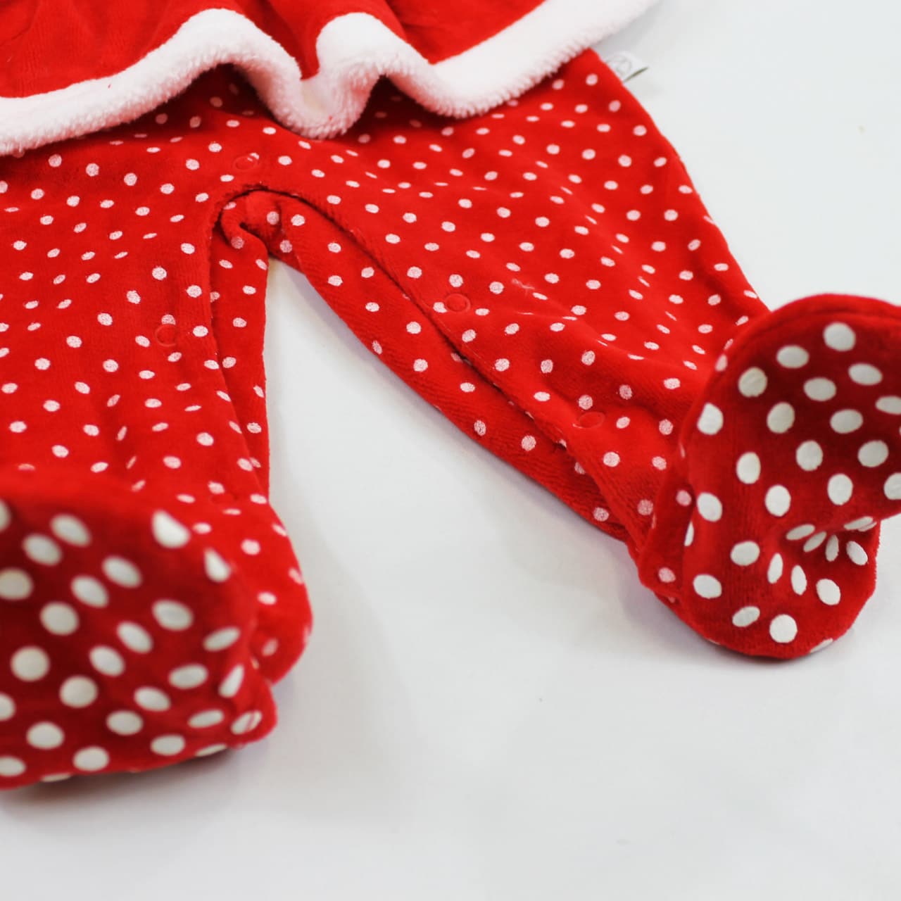 maglia a manica lunga con pois bianchi, bottoncini rossi, gonnellina, bordini vellutati e cintura nera; pantalone decorato con pois bianchi e piedini con gommini antiscivolo; cappellino natalizio roso con bordino vellutato bianco.