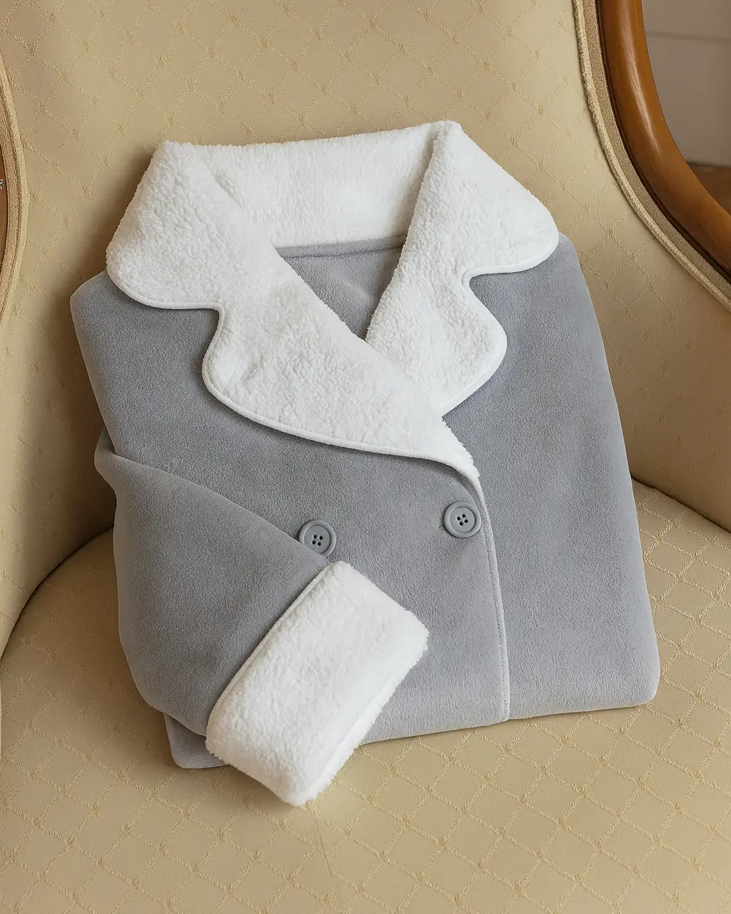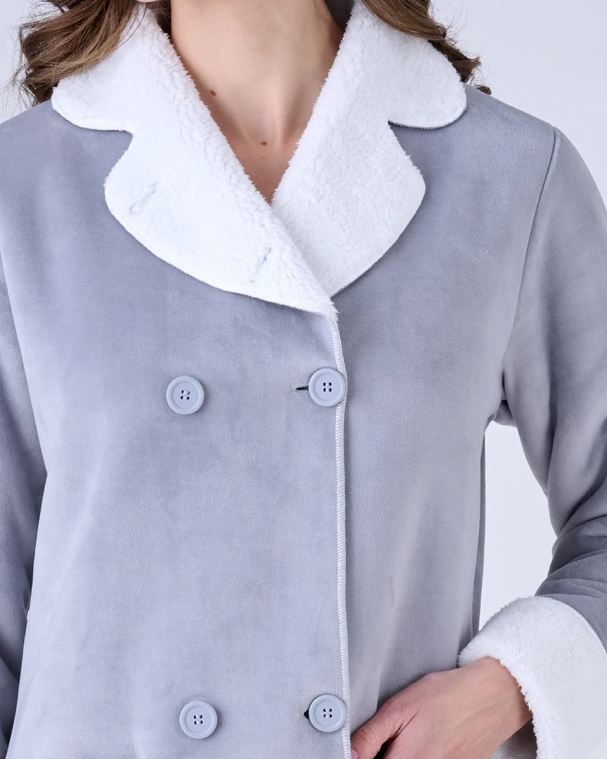 Il design con bottoni frontali doppi e le pratiche tasche laterali rendono questa vestaglia funzionale oltre che elegante. Il colore grigio chiaro la rende versatile e facile da abbinare a qualsiasi pigiama o coordinato notte.