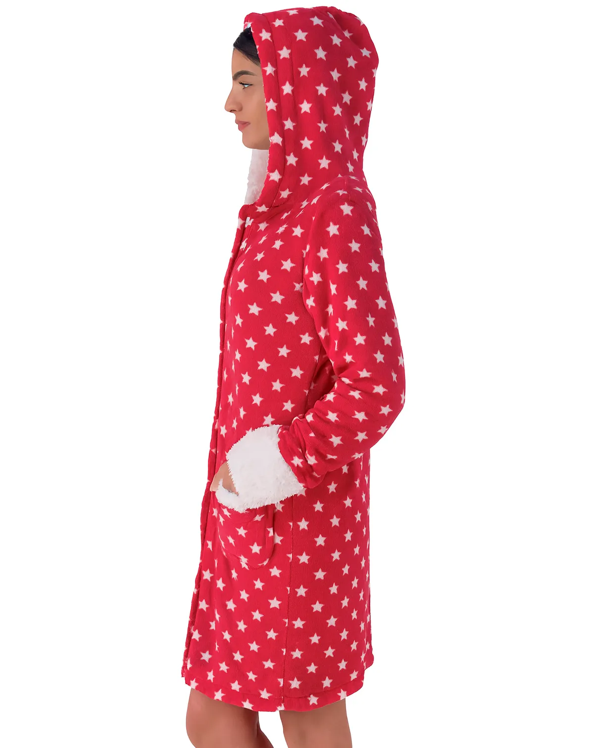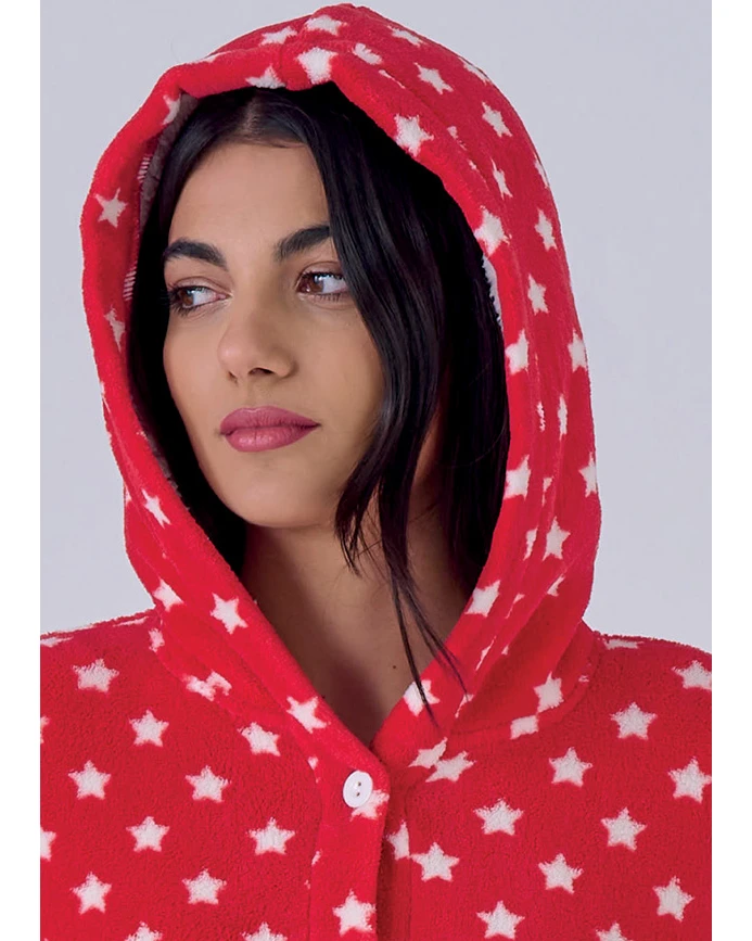 interno in caldo tessuto agnellato sherpa e simpatica stampa di stelline su fondo rosso. Vestaglietta che veste dalla S alla XL e realizzata con tessuti di qualità e finiture di pregio.